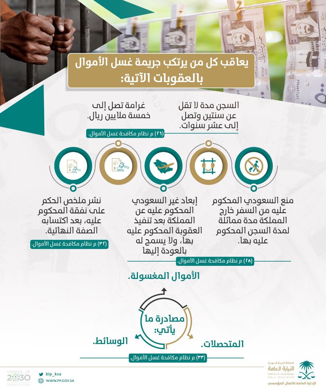 النيابة العامة: عقوبة غسل الأموال تصل لـ10 سنوات سجن و5 ملايين ريال غرامة
