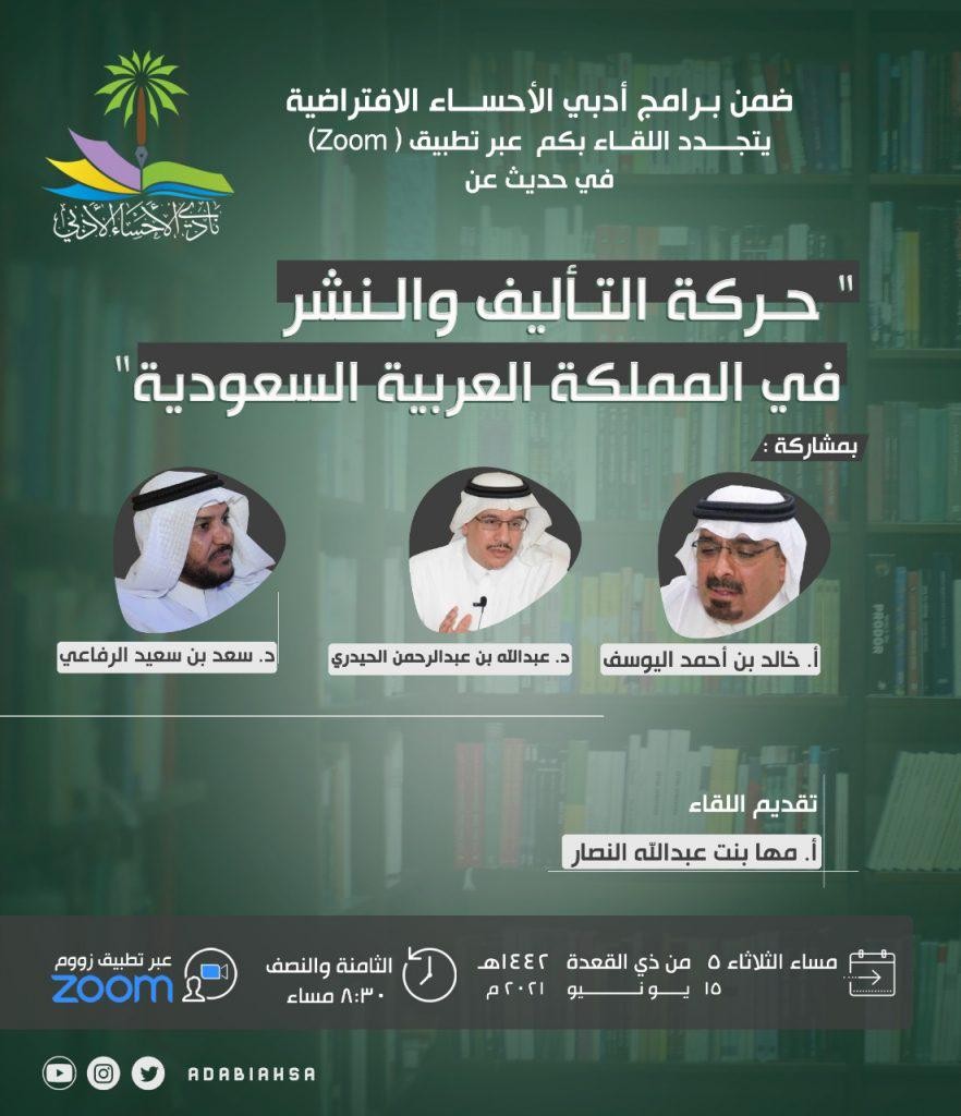نظم النادي الأدبي الثقافي بالأحساء لقاء بعنوان "حركة التأليف والنشر في المملكة العربية السعودية"، وذلك انطلاقا من الدور الكبير الذي يقوم به نادي كمؤسسةً ثقافيةً تساهم في نشر الثقافة الأدبية والفكرية والعلمية والمعرفية وخدمة جمهور المثقفين والمثقفات ، بإشراف رئيس النادي الأدبي الدكتور ظافر الشهري.