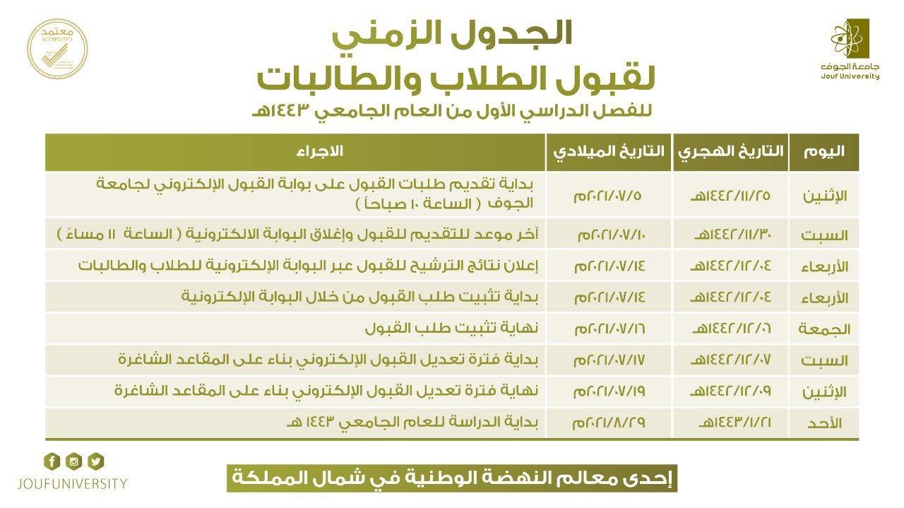جامعة الجوف تعلن مواعيد القبول في برامج البكالوريوس والدبلوم للعام الجامعي 1443 هـ
