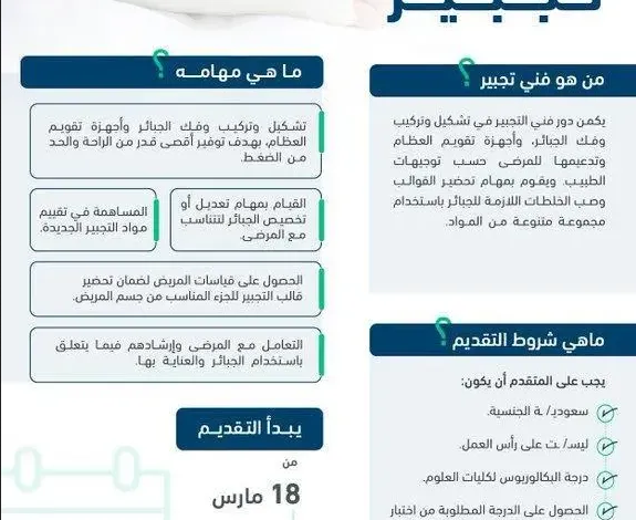 أعلنت الهيئة السعودية للتخصصات الصحية، عن بدء التقديم على الدفعة الأولى من برنامج “فني تجبير”، عبر بوابة الهيئة الإلكترونية، و يستمر حتى 25 مارس الجاري.