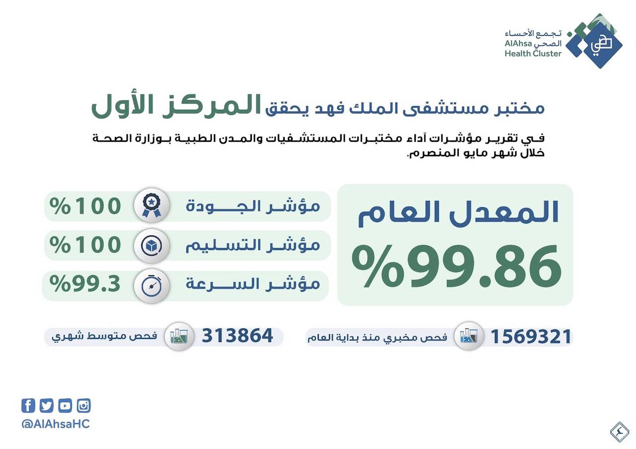 حصد مختبر مستشفى الملك فهد بالهفوف المركز الأول في تقرير مؤشرات أداء مختبرات المستشفيات والمدن الطبية بوزارة الصحة خلال شهر مايو المنصرم.
