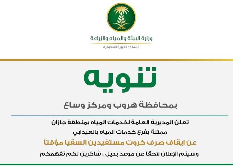 تعلن المديرية العامة لخدمات المياه بمنطقة جازان