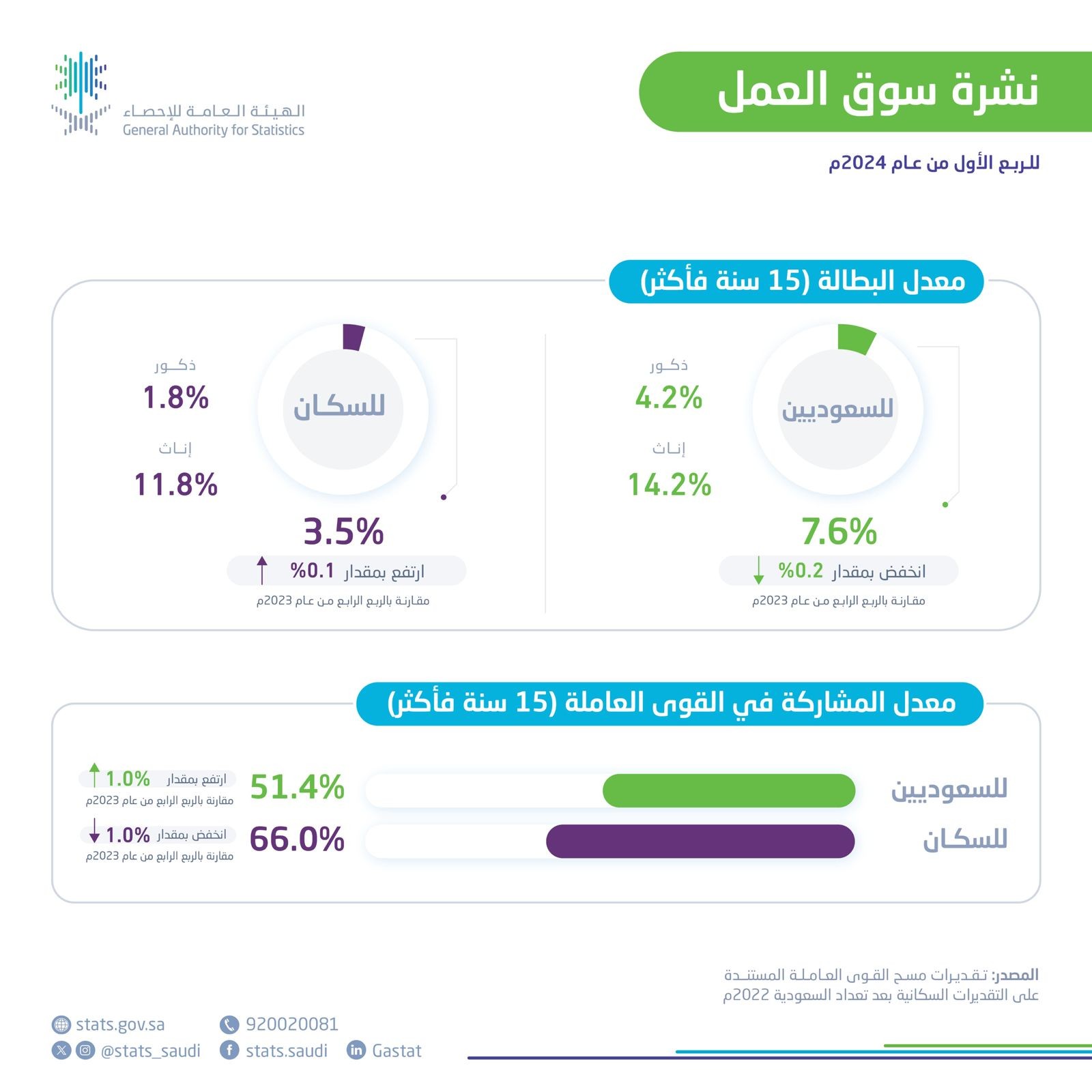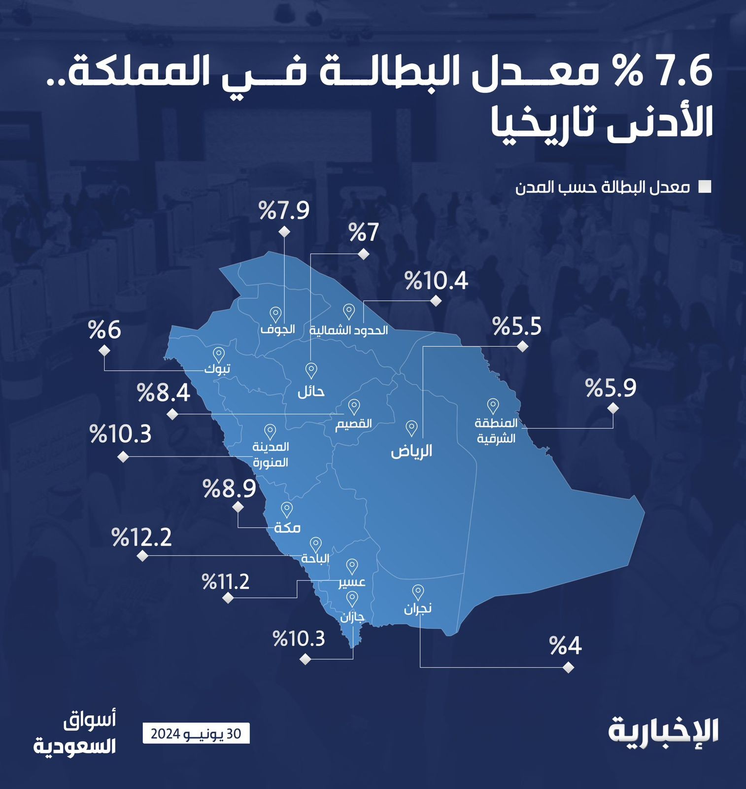 وصل معدل البطالة إجمالي إلى 7.5% في السعودية كحد ادنى تاريخيا. يعتبر هذا الرقم جيد مقارنة بالخمس سنوات الاخيره . حيث انه استقر المعدل بنسبة 3.5% في الربع الاول من 2024 حسب الأرقام التي نشرتها هيئة الاحصاء عبر موقعها الرسمي . حيث ارتفعت نسبة القوى العاملة 51% في الربع الاول مقارنة 50% في الربع السابق . الجدير بالذكر ، وصلت النسبة في منطقة الرياض 5.5 % . في منطقة الشرقيه 5.9% . في منطقة الحدود الشمالية 10.4% . في منطقة الجوف 7.9%. في منطقة تبوك 6%. في منطقة حائل 7% . في المدينة المنورة 10.3% . في منطقة مكة المكرمة 8.9%. الباحة 12.2% . عسير 11.2% . جازان 10.3%. نجران 4%. في منطقة القصيم 8.4% .