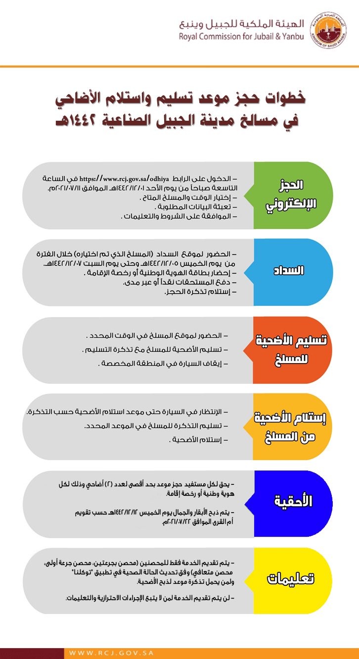 حيث تم التأكد من توفر جميع المستلزمات الخاصة بتقديم الخدمة من قبل مستثمر المسلخ وجاهزيته بالإضافة إلى الموقع الإلكتروني المخصص (أضحية) www.rcj.gov.sa/odhiya والذي يمكن المستفيدين من حجز مواعيد تسليم واستلام الأضاحي تسهيلاً لهم.