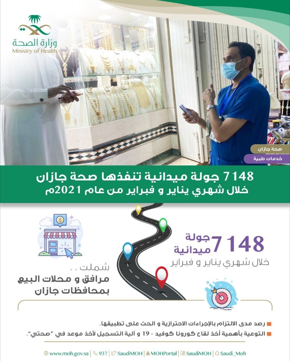 نفّذت الفرق الميدانية بصحة جازان 7148 جولة ميدانية وذلك خلال شهري يناير وفبراير 2021 م، شملت مرافق ومحلات البيع في عدد من المواقع بمحافظات جازان.
