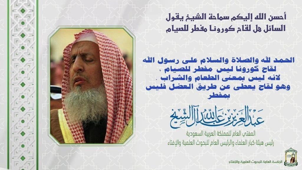 أوضح سماحة المفتي العام للمملكة رئيس هيئة كبار العلماء الرئيس العام للبحوث العلمية والإفتاء الشيخ عبدالعزيز بن عبدالله آل الشيخ، أن لقاح كورونا ليس مفطر للصيام.