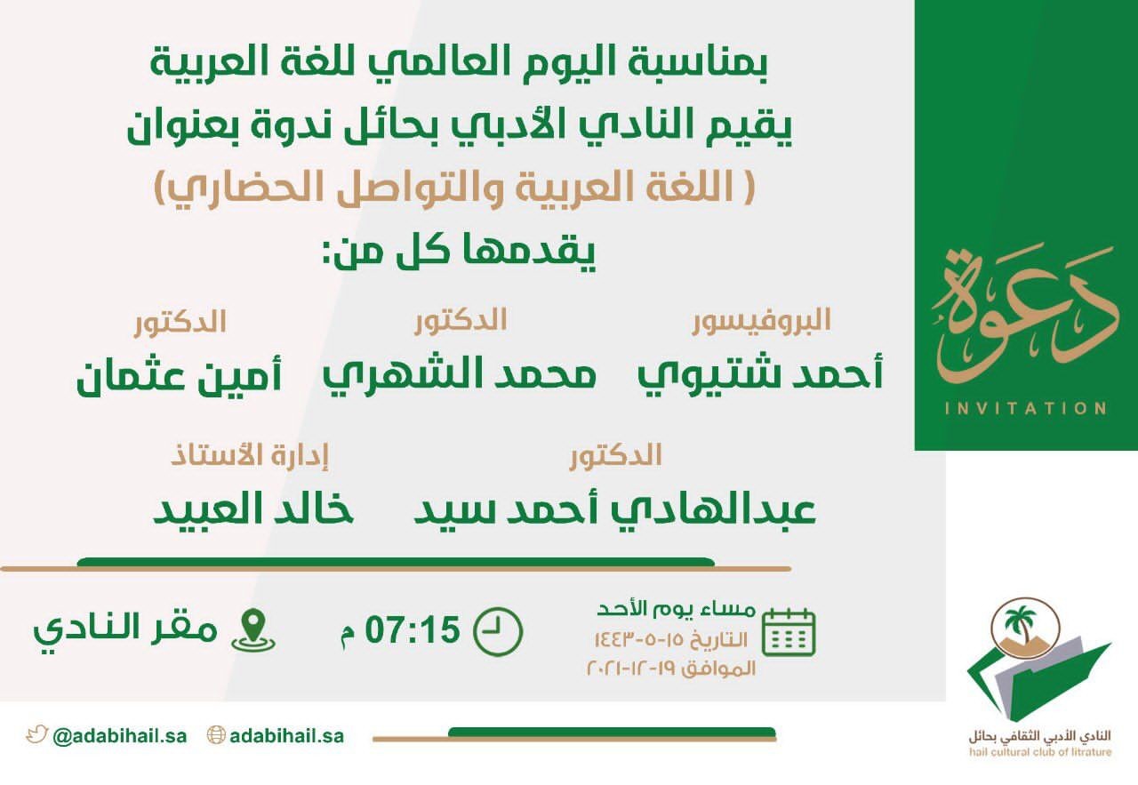 ينظم النادي الأدبي الثقافي في منطقة حائل بعد غد الأحد بمقر النادي , ندوة بعنوان اللغة العربية والتواصل الحضاري بمناسبة اليوم العالمي للغة العربية، يقدمها عدد من المختصين .