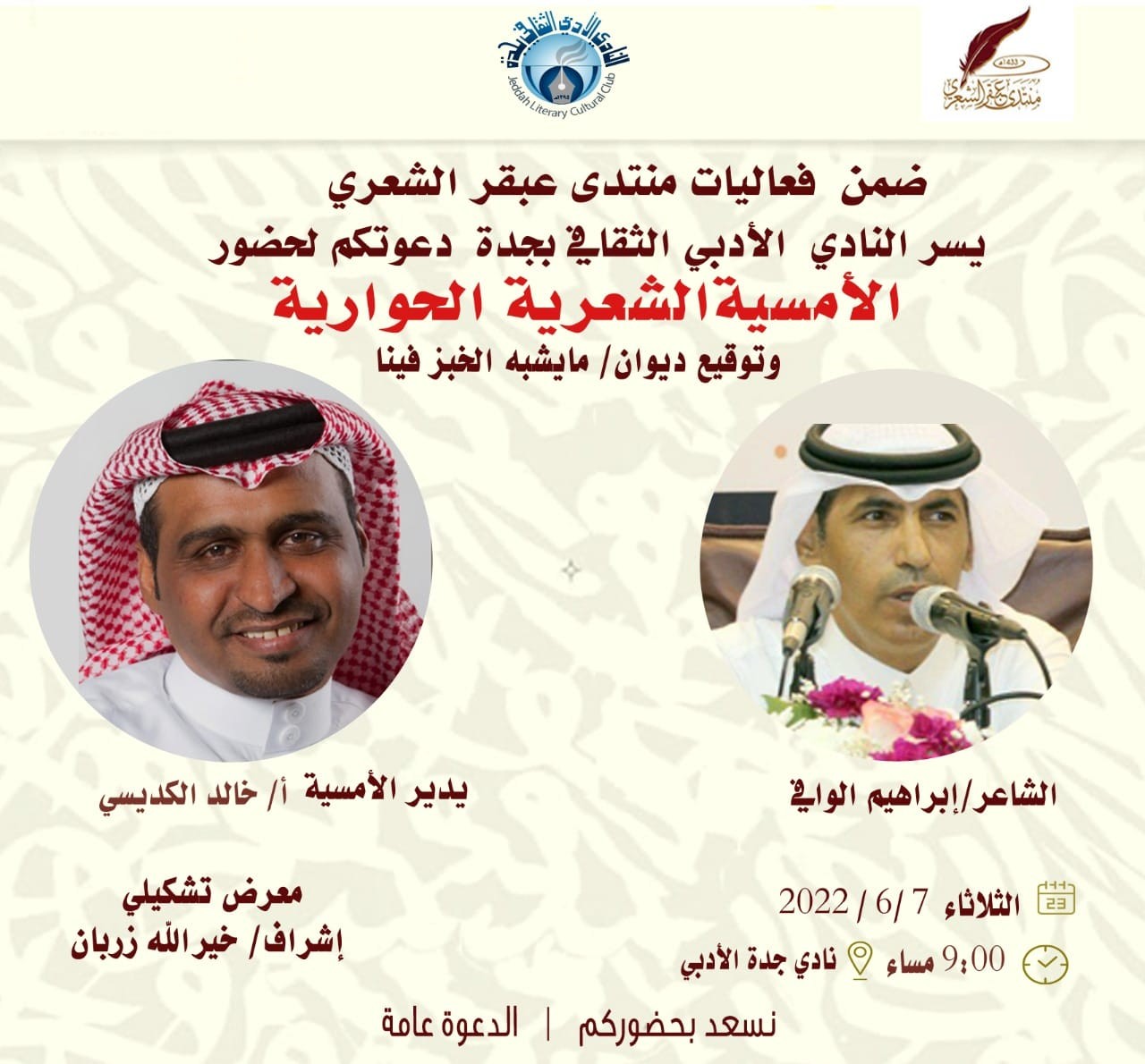 ينظّم منتدى عبقر الشعري بالنادي الأدبي الثقافي بجدة، بعد يوم غدٍ الثلاثاء، أمسية شعرية حوارية للشاعر ابراهيم الوافي، ويدير الأمسية الأستاذ الشاعر خالد الكديسي نائب رئيس منتدى عبقر الشعري.