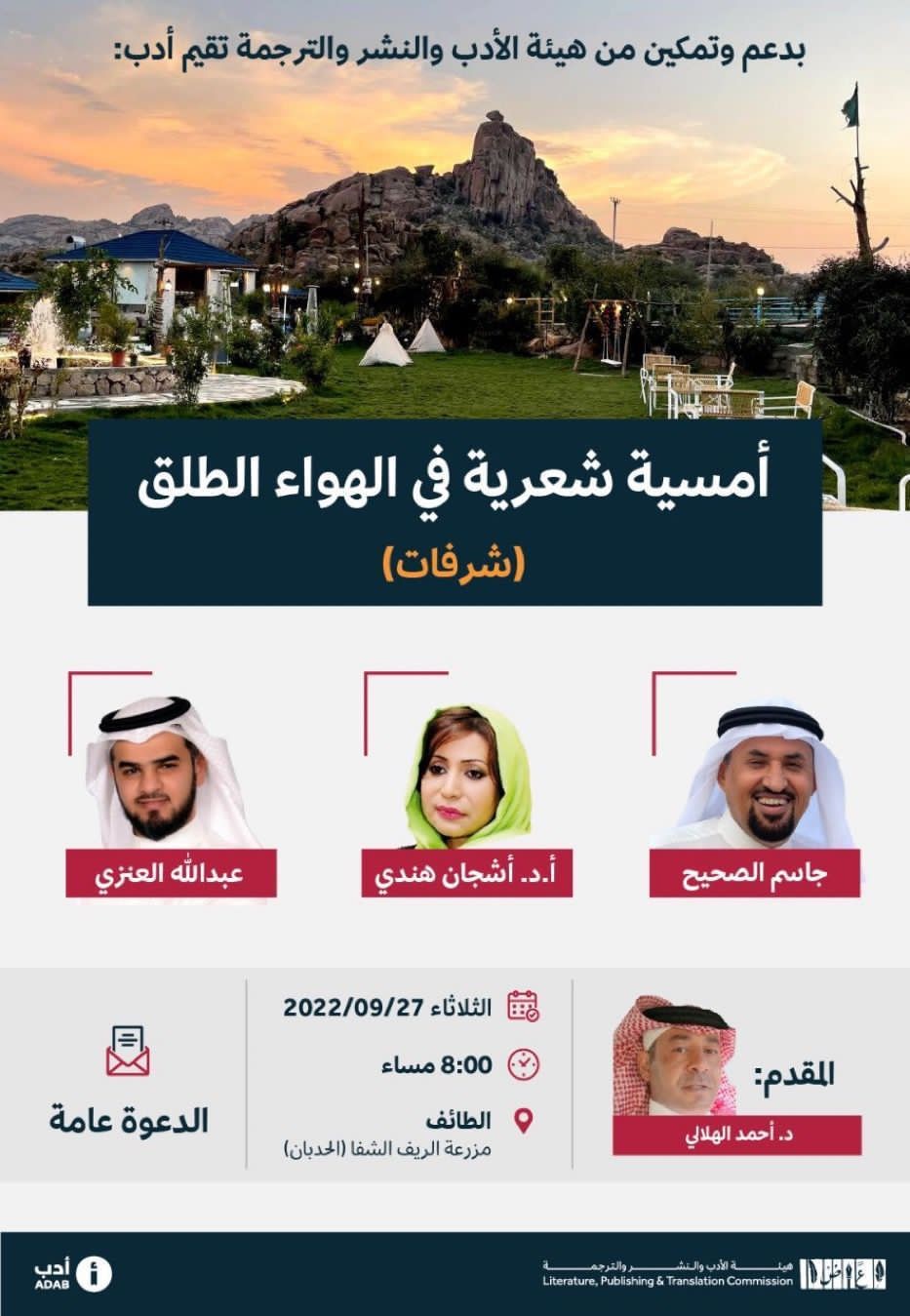 تستضيف موسوعة أدب غداً الثلاثاء بدعم وتمكين من هيئة الأدب والنشر والترجمة، ثلاثة شعراء كبار في أمسية شعرية بالطائف في فضاءات مفتوحة ودينامية جديدة.