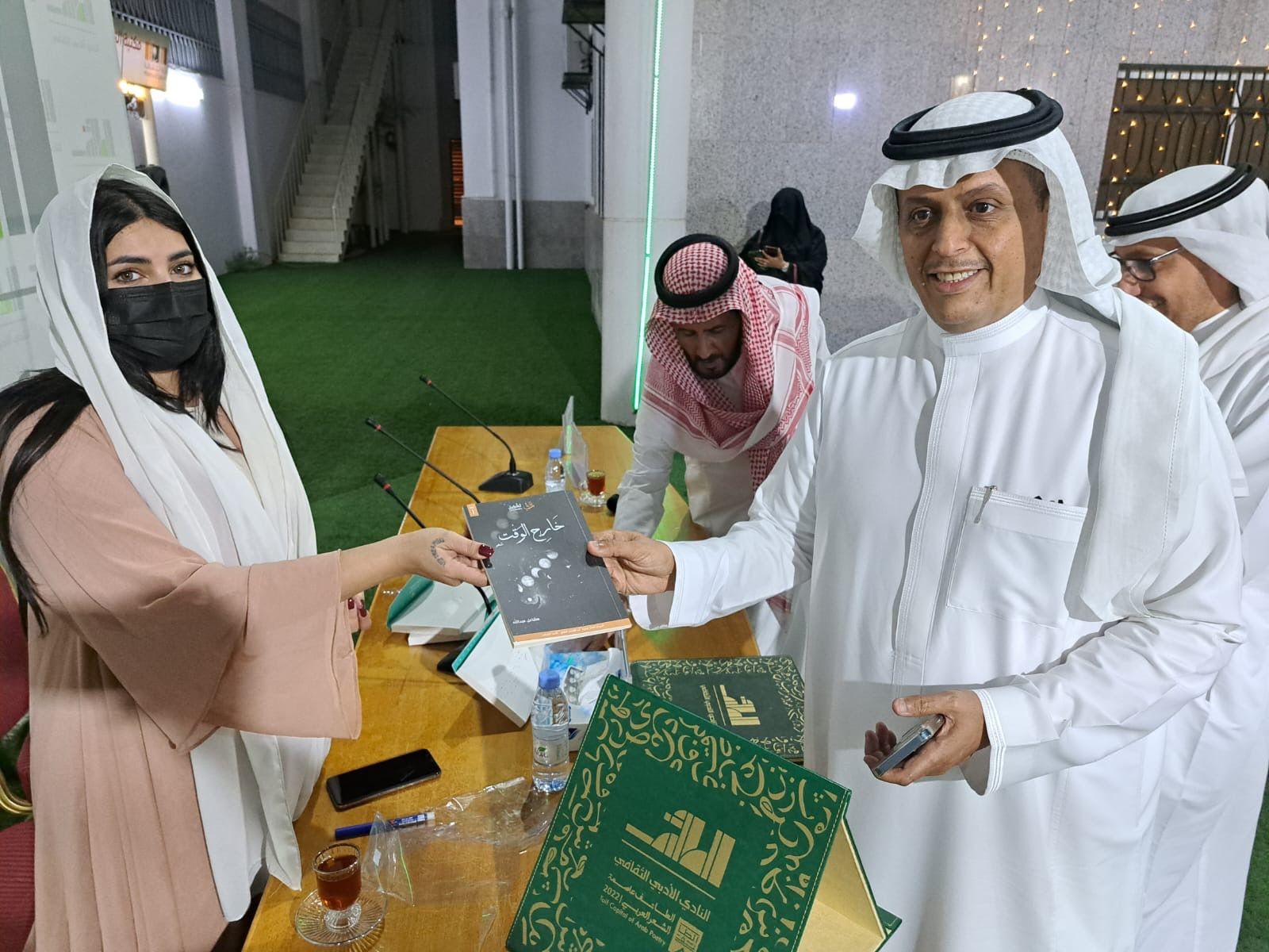 وفي ختام الأمسية قام رئيس النادي الأدبي الثقافي بالطائف/ الأستاذ عطا الله الجعيد بعد مداخلته بمشاركة الدكتور أحمد الهلالي، في تكريم الشاعرات ومديرة الأمسية والتقاط الصور التذكارية،  ثم وقعت الشاعرة مشاعل الحربي  ديوانها( خارج الوقت ) للحضور كما أهدت نسخا منه لمكتبة النادي .