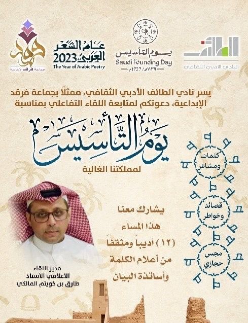 أقام النادي الأدبي الثقافي بالطائف أمسيته الخاصة احتفاءً بيوم التأسيس بتنظيم من جماعة فرقد الإبداعية بالنادي بمشاركة 12 أديبا ومثقفا من أعلام الكلمة وأساتذة البيان بإدارة الأستاذ طارق بن خويتم المالكي