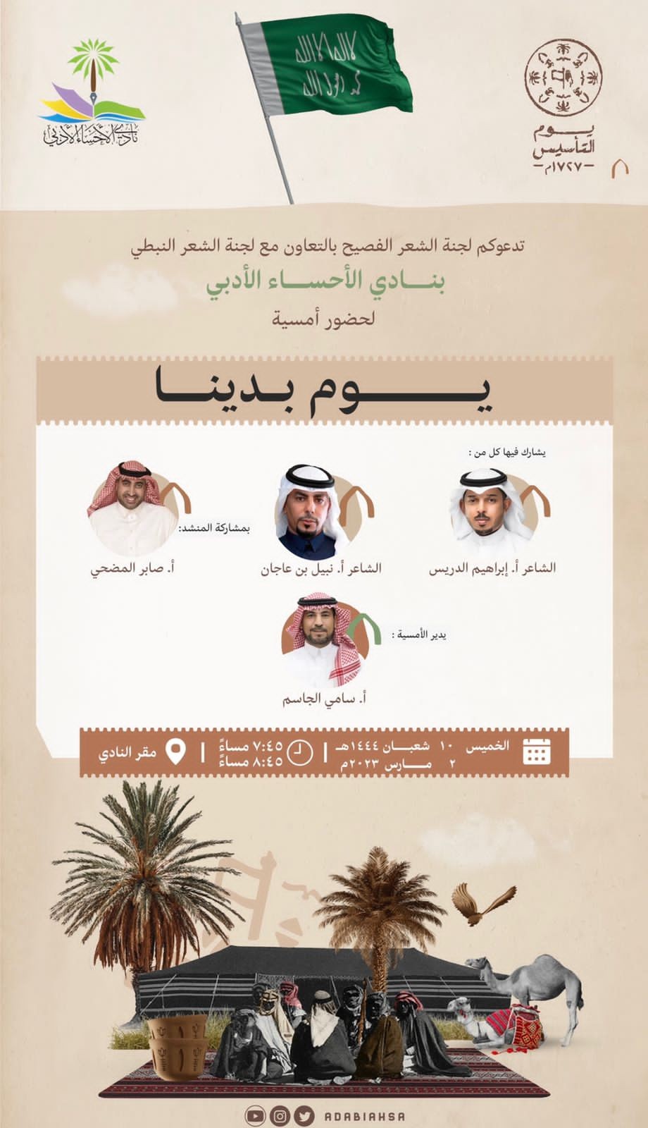 في خطوة نوعية وغير مسبوقة على مستوى الأندية الأدبية السعودية تقيم لجنة الشعر الفصيح بنادي الأحساء الأدبي أمسية شعرية مشتركة بالتعاون مع لجنة الشعر النبطي بالنادي بعنوان ( يوم بدينا ) وذلك يوم الخميس العاشر من شعبان الموافق 2 مارس وذلك في تمام الساعة السابعة وخمسة وأربعين دقيقة مساءاً بمسرح النادي .
