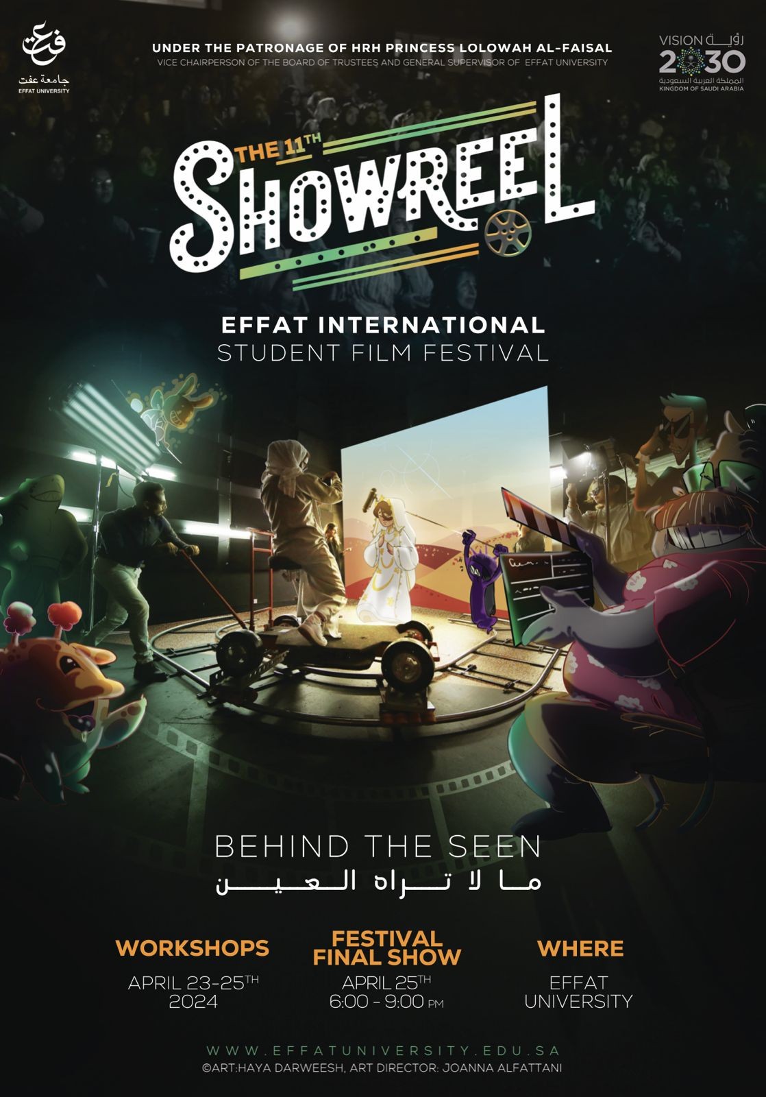 تستعد جامعة عفت لإطلاق الدورة الحادية عشرة من مهرجان عفت السينمائي الدولي لأفلام الطلاب تحت شعار “مالا تراه العين” وذلك في الفترة من 23 إلى 25 إبريل القادم في مقر جامعة عفت بجدة. حيث يتم الاحتفاء بتجارب أفلام الطلبة من أفلام وثائقية وأفلام قصيرة وأفلام رسوم متحركة، حيث وصلت عدد الأفلام المقدمة للمسابقة أكثر من 2150 فيلم من أكثر من 100 دولة، بينما اشتملت القائمة القصيرة لأفضل الأفلام علي 56 فيلماُ فقط من 28 دولة، كما تصل مجمل الجوائز المالية المُقدمة إلى أكثر من خمسين ألف ريال سعودي.