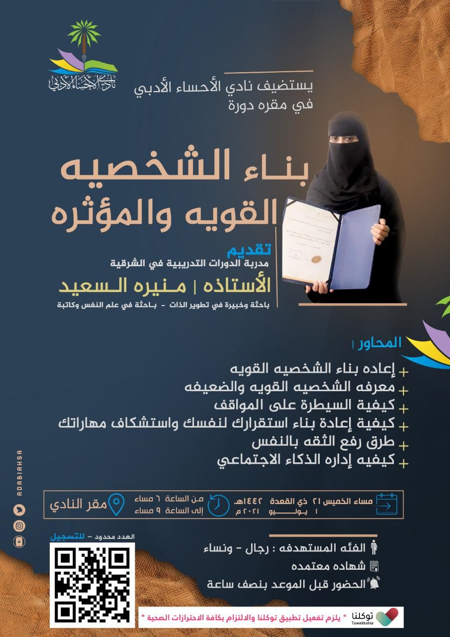 ينظم نادي الأحساء الأدبي دورة في " بناء الشخصية القوية والمؤثرة " والتسجيل متاح للشباب والشابات وتقام هذه الدورة في مقر النادي مساء الخميس ٢١ / من ذي القعدة ١٤٤٢هـ الموافق ١ / يوليو ٢٠٢١م عند الساعة السادسة مساء وتستمر حتى التاسعة ، وتقدمها المدربة الشابة الأستاذة : منيرة السعيد ، وهي باحثة ومدربة وخبيرة في تطوير الذات .