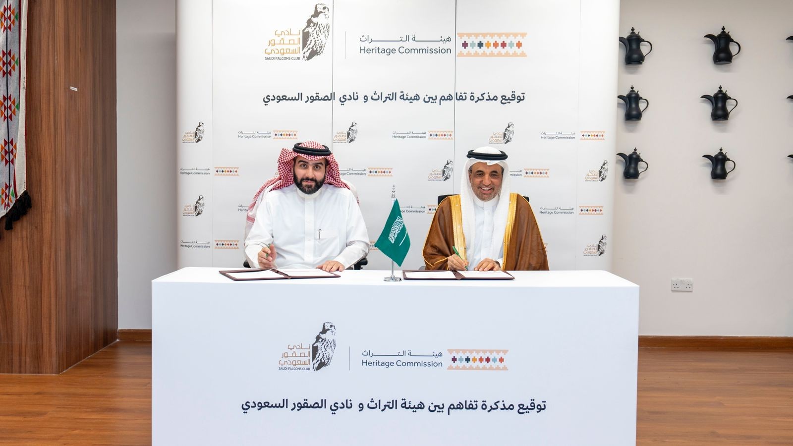ومثّل هيئة التراث في توقيع الاتفاقية الرئيس التنفيذي الدكتور جاسر بن سليمان الحربش، فيما مثّل نادي الصقور السعودي في التوقيع الرئيس التنفيذي للنادي طلال بن عبدالعزيز الشميسي، وجرى ذلك بمقر هيئة التراث في حي المربّع بالعاصمة الرياض.