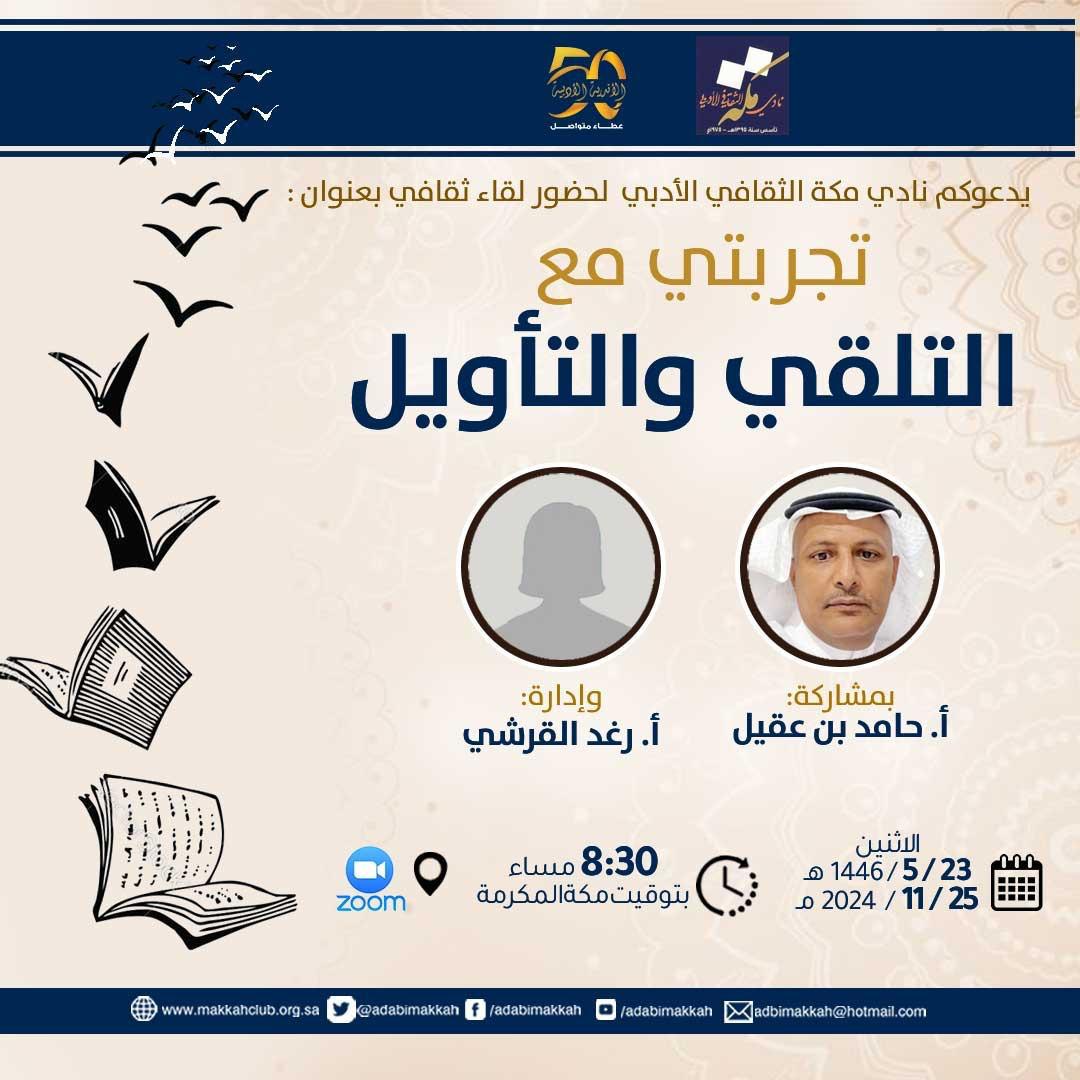 يقيم نادي مكة الثقافي الأدبي لقاءً ثقافيًا بعنوان "تجربتي مع التلقي والتأويل" عبر منصة "زووم" بمشاركة الأستاذ حامد بن عقيل ، وستدير اللقاء الأستاذة رغد القرشي وذلك في تمام الثامنة والنصف من مساء اليوم الإثنين الموافق 25 نوفمبر 23-جمادى الأولى.