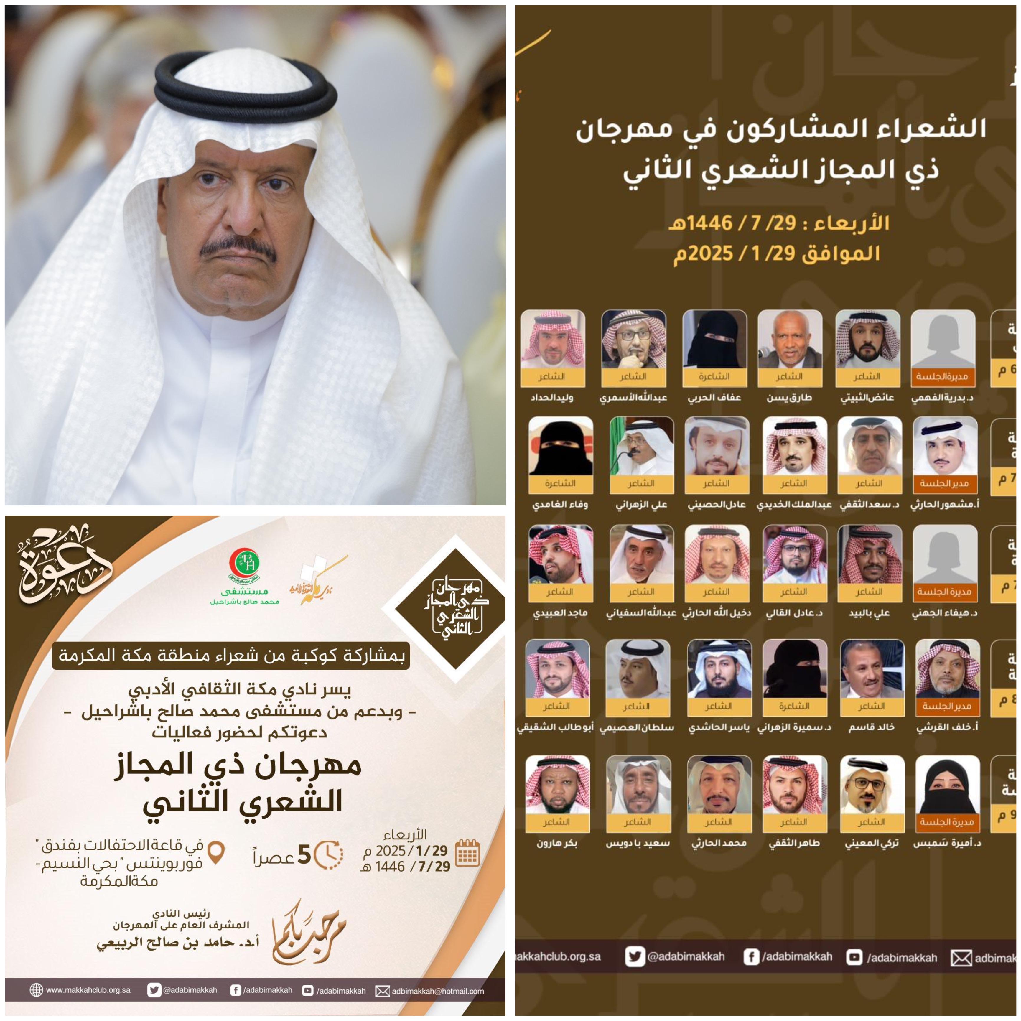 تنطلق اليوم الاربعاء، فعاليَّات الدورة الثَّانية من مهرجان ذي المجاز الشعريِّ، الذي ينظِّمه نادي مكَّة الثقافيِّ الأدبيِّ، بدعم من مستشفى محمد صالح باشراحيل.