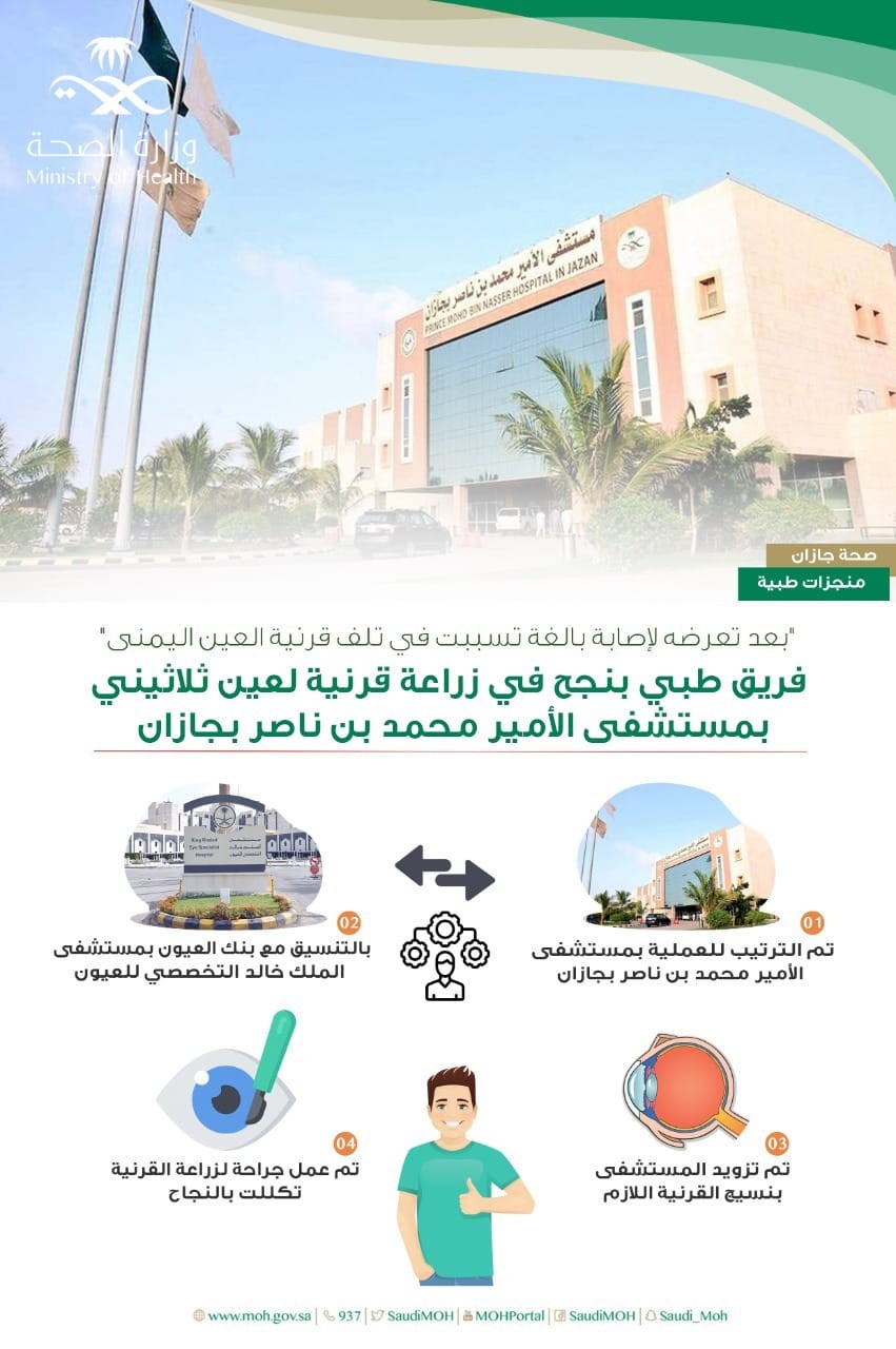 وقالت صحة جازان في التفاصيل بأن المريض حضر إلى المستشفى وكان يعاني من تلف قرنية العين اليمنى نتيجة إصابة مباشرة تعرض لها، وبعد إجراء الفحوصات الطبية اللازمة تبين حاجة المريض إلى إجراء زراعة قرنية لاستعادة البصر .