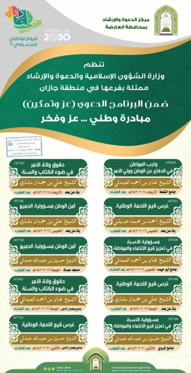 نفذت وزارة الشؤون الإسلامية والدعوة والإرشاد ممثلة بفرعها في منطقة جازان " مركز دعوة العارضة " ضمن برنامجها الدعوي ( عز وتمكين ) مبادرة وطني عز وفخر حيثُ انطلقت محاضرات المركز مساء الأربعاء الماضي واختتمت مساء يوم الاثنين