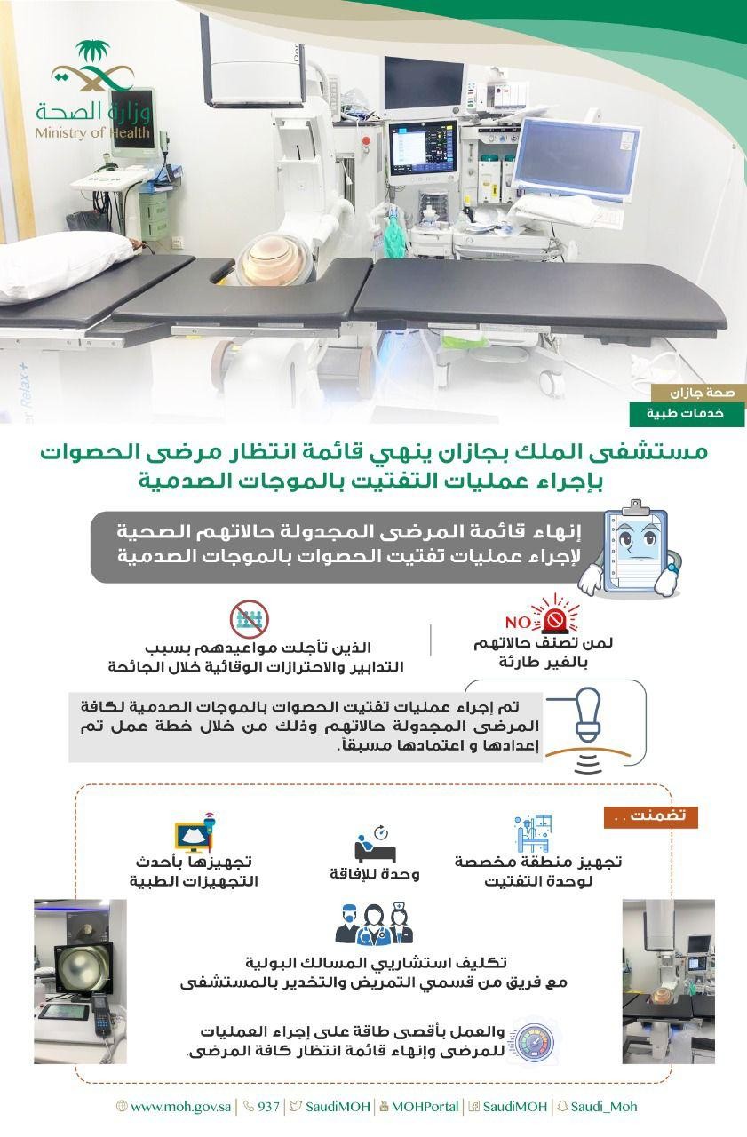 نجحت إدارة مستشفى الملك فهد المركزي بجازان في إنهاء قائمة المرضى المجدولة حالتهم الصحية لإجراء عمليات تفتيت الحصوات بالموجات الصدمية لمن تصنف حالاتهم بالغير طارئة والتي تأجلت مواعيد إجراء العمليات الخاصة بهم ضمن إتخاذ التدابير والاحترازات الوقائية خلال فترة تفشي فايروس كورونا " كوفيد 19 " .