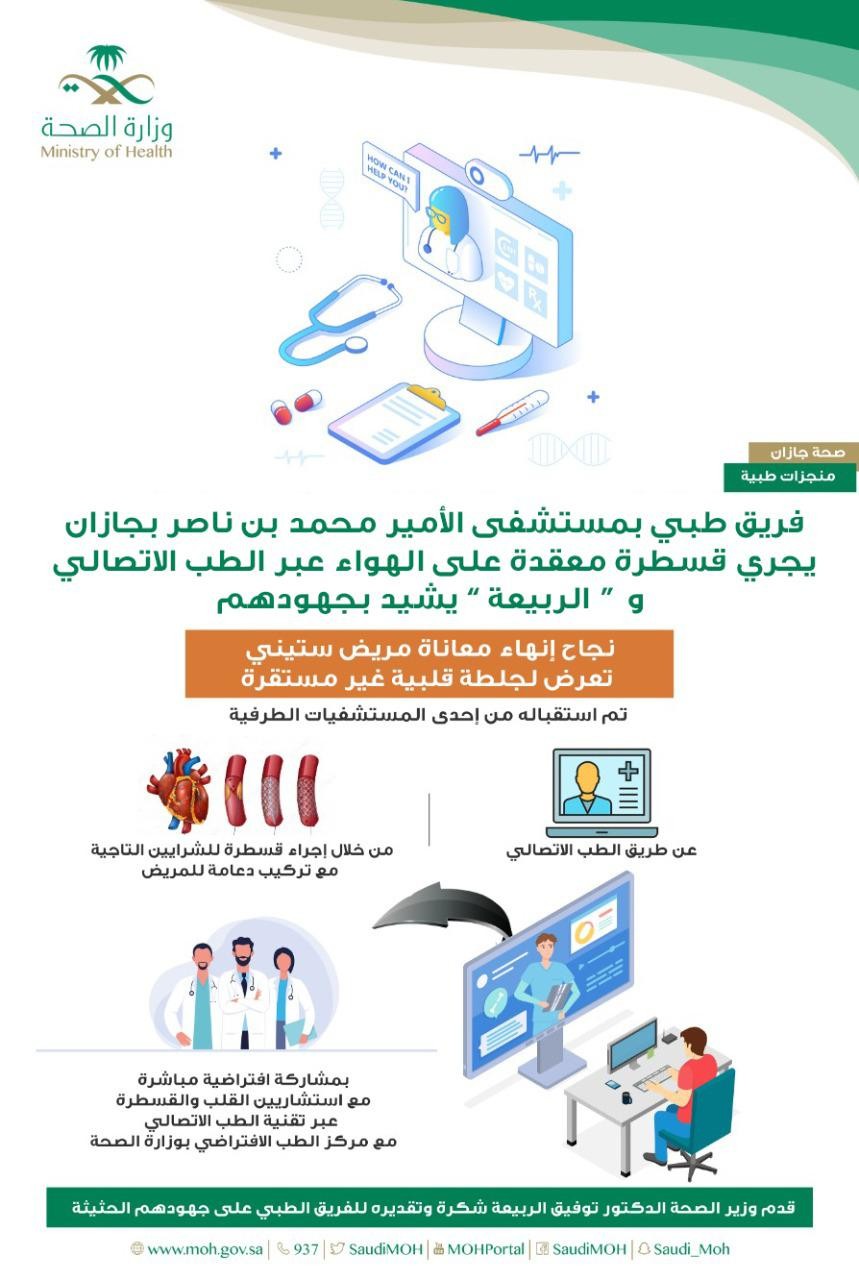 وأوضحت : بأنه قد تم نقل وقائع القسطرة القلبية على الهواء مباشرة عبر تقنية الطب الإتصالي مع المركز الطبي الإفتراضي بوزارة الصحة والذي يضم نخبة من استشاريين القلب الذين تابعوا الخطوات العلاجية التي خضع لها المريض عبر التقنيات الرقمية الحديثة حتى تماثل للشفاء ولله الحمد , مشيدين في نفس الوقت بالتجهيزات التقنية العالية التي يحظى بها مركز القلب بمستشفى الأمير محمد بن ناصر بجازان .