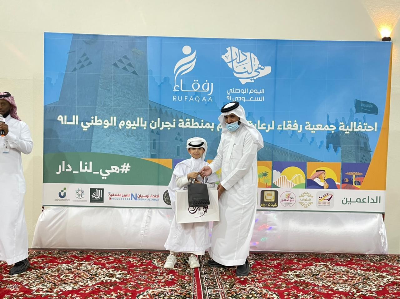 أقامت جمعية "رفقاء" لرعاية الأيتام بمنطقة نجران احتفالًا بمناسبة اليوم الوطني السعودي "٩١"، واشتمل الحفل على عدة فقرات ونماذج مشرفة من أبناء الجمعية المتميزين والتي تفخر بهم الجمعيه والمجتمع ، بالإضافة إلى المسابقات والفعاليات الترفيهية المتنوعة، كما تم تكريم المتميزين والداعمين والمتطوعين الذين كانت لهم لمسة مميزة في نجاح هذا المحفل .