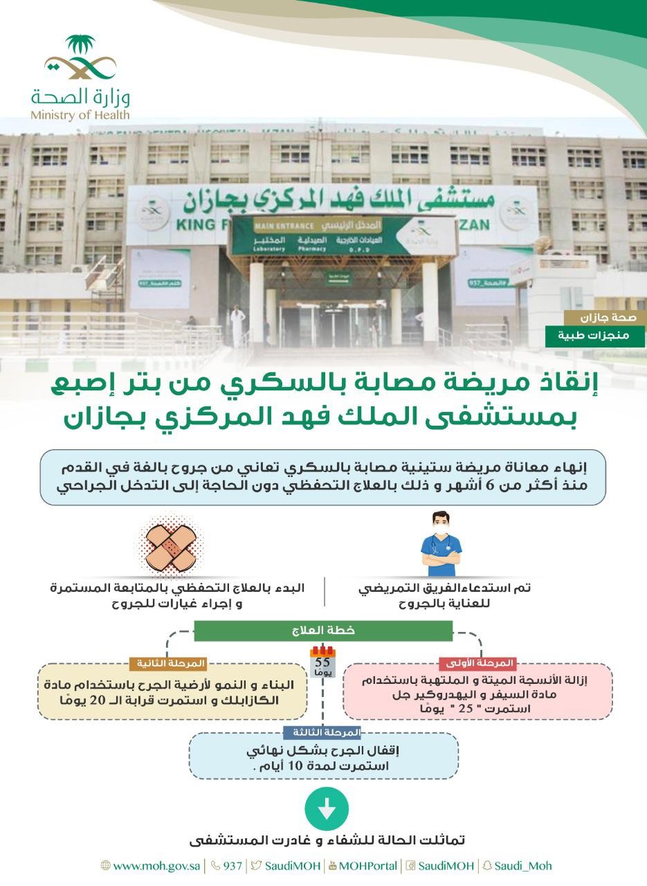 وذكرت صحة جازان بأن مستشفى الملك فهد المركزي بجازان استقبل مريضة في العقد السادس من العمر وهي تعاني من جروح بالغة في القدم منذ أكثر من 6 أشهر كادت أن تتعرض إلى بتر بأصبع القدم خصوصاً وأنها مصابة بداء السكري، تم استدعاء فريق العناية بالجروح التمريضي الذي بدوره اعتمد خطة العلاج التحفظي التي تضمنت المتابعة المستمرة وإجراء غيارات للجروح كل يومين للحفاظ على الأصبع من إجراء عملية البتر.