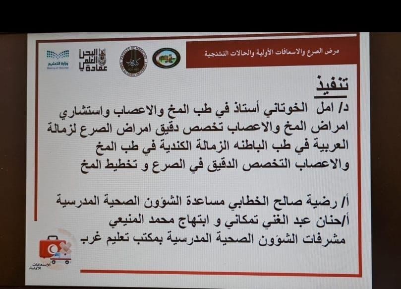 بعنوان ( مرض الصرع والإسعافات الأولية للحالات التشنجية ) لقاء تدريبي تنفذه إدارة الشؤون الصحية والمدرسية بتعليم مكة