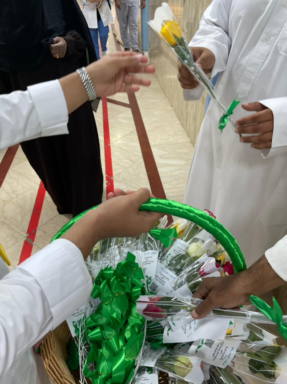 وبالمقابل قام فريق جرعة سعادة بإستقبال مراجعى المجمع بالعيادات الخارجية والطوارئ بالورود و الهدايا المرفق بها الباركود الذي يحمل جميع الروابط والمعلومات التوعوية الخاصة بالصحة النفسية.