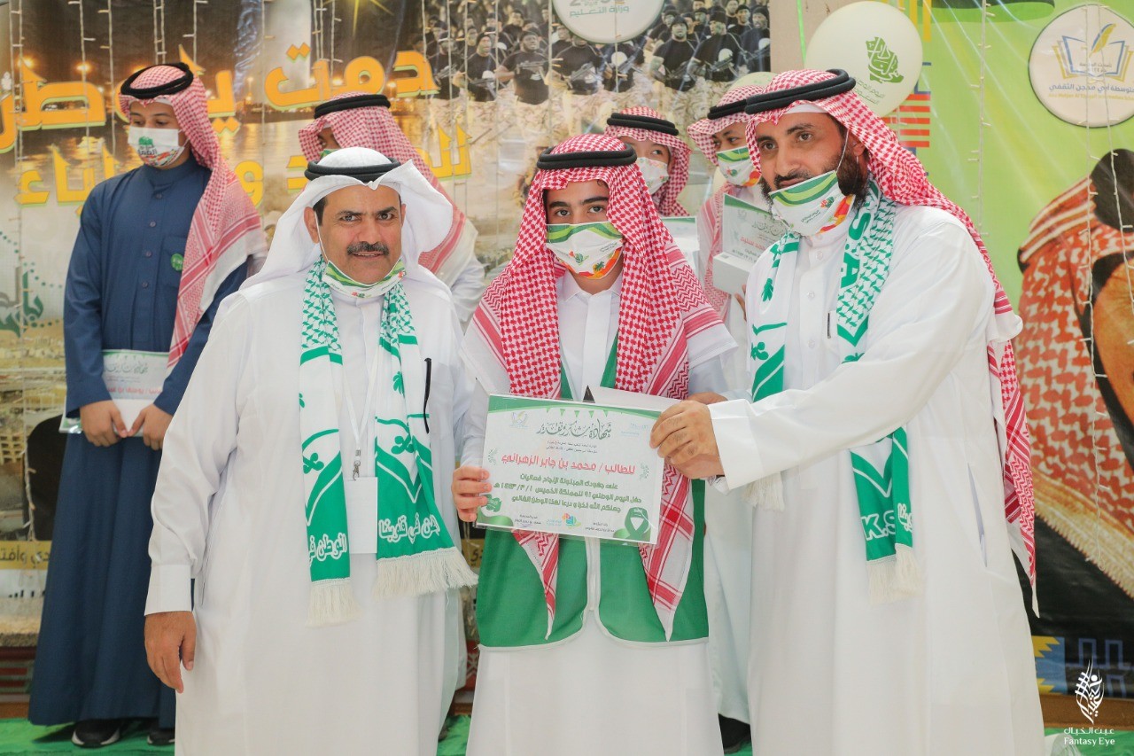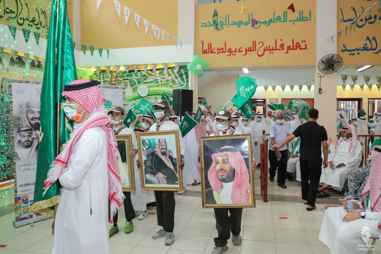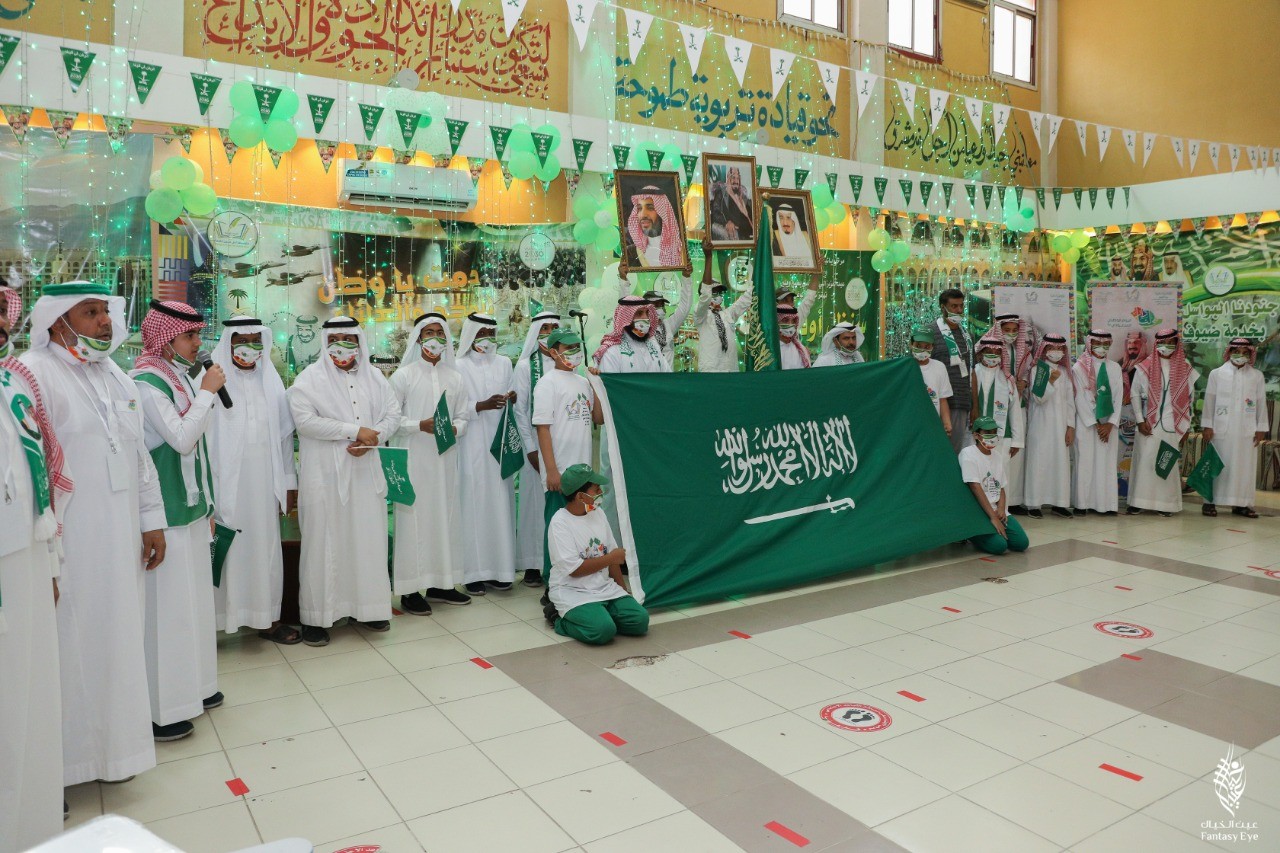 حفل اليوم الوطني ٩١ للمملكة العربية السعودية تحت شعار( هي دار لنا ) بحضور مشرف النشاط الطلابي ظافر بن مزهر الشمراني وحضور المعلمين والطلاب مع اتخاذ كافة الإجراءات الوقاية ،من لبس الكمامة، والتباعد الجسدي ، وشارك الطلاب  بالمسيرة الوطنية ، والسلام الوطني.