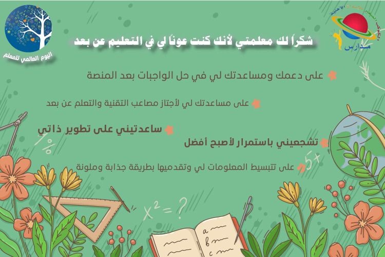 كما تحدثت المعلمات للأطفال من خلال منصة مدرستي عن أول معلم للناس وفضل المعلم وما يجب أن يكون له من تقدير ومكانة لدى الدارسين والمجتمع وفضل المعلمين على المجتمع كما سيتم مناقشة جهود المملكة العربية مع وزارة التعليم ووزارة الصحة خلال جائحة كورونا مما له أكبر الأثر على مواصلة التعليم وأهميته لأنه بنشر العلم يتطور المجتمع ويرتقي وبالجهل يتراجع المجتمع، ثم يعدد الأطفال بعضا من المعلمين الذين مروا بهم من خلال دراستهم وماذا تعلموا منهم، ثم بعد ذلك يتم إيضاح أن شكر المعلم والاعتراف بفضله واجب على كل متعلم.