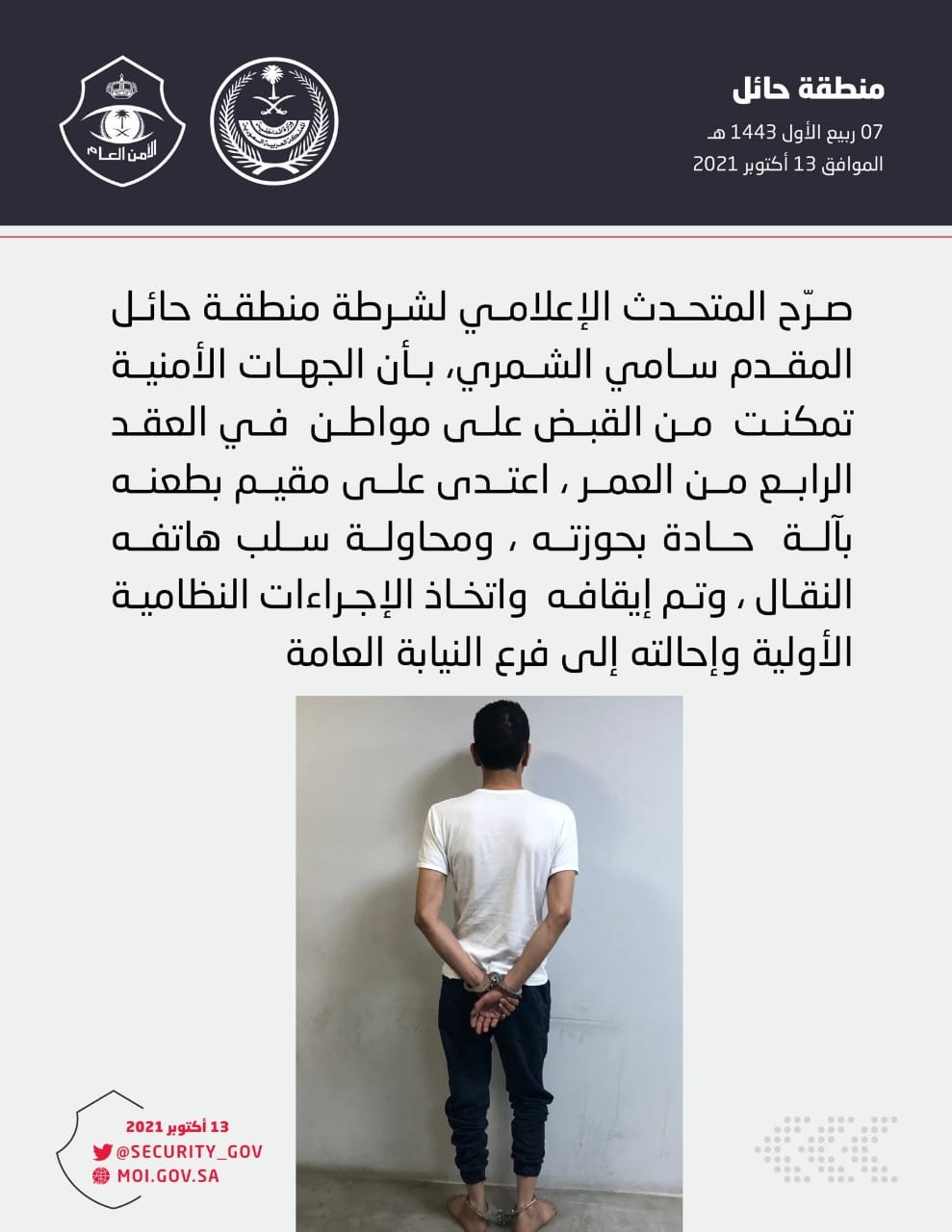 صرّح المتحدث الإعلامي لشرطة منطقة حائل المقدم سامي الشمري، بأن الجهات الأمنية تمكنت من القبض على مواطن في العقد الرابع من العمر، اعتدى على مقيم بطعنه بآلة حادة بحوزته، ومحاولة سلب هاتفه النقال، وتم إيقافه واتخاذ الإجراءات النظامية الأولية وإحالته إلى فرع النيابة العامة.