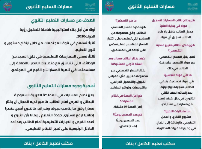 جدير بالذكر أن المسارات في التعليم الثانوي تسهم في بناء استراتيجية شاملة لتحقيق رؤية الدولة 2030 وكذلك في قوة المجتمعات من خلالارتفاع مستوى و تنوع التعليم، كما تسعى الممارسات التعليمية في خلق العديد من الوظائف التي تتناسق مع متطلبات العصر بالاضافة الىمساهمتها في تنمية المهارات و القيم في المجتمع.