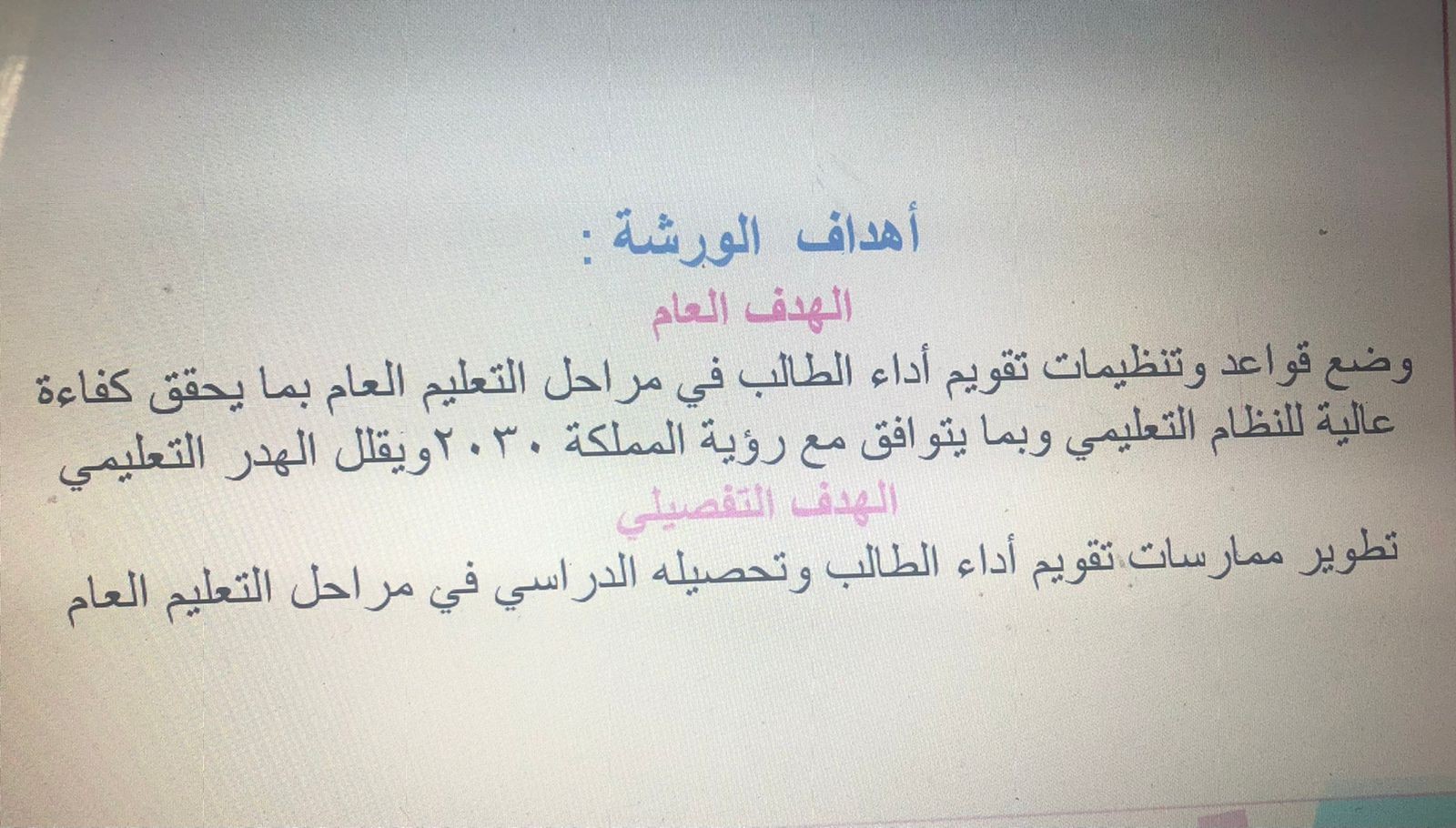 هدفت الورشة إلى وضع قواعد وتنظيمات تقويم أداء الطالب في مراحل التعليم العام بما يحقق كفاءة عالية للنظام التعليمي بما يتوافق مع رؤية المملكة 2030ويقلل الهدر التعليمي، مع تطوير ممارسات تقويم أداء الطالب وتحصيله الدراسي في مراحل التعليم العام