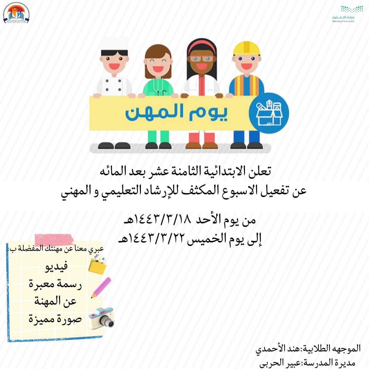 نفذت الابتدائية الثامنة عشر بعد المائةالتابعة لمكتب تعليم شمال مكة بالإدارة العامة للتعليم بمنطقة مكة المكرمة لمدة أسبوع ابتداءً من يوم الأحد الموافق 18/ 3 / 1443هـ، برنامجً تدريبياً بعنوان (الارشادالتعليمي المهني) نفذهُ الموجهة الطلابية هند الأحمدي بإشراف القائدة عبير الحربي
