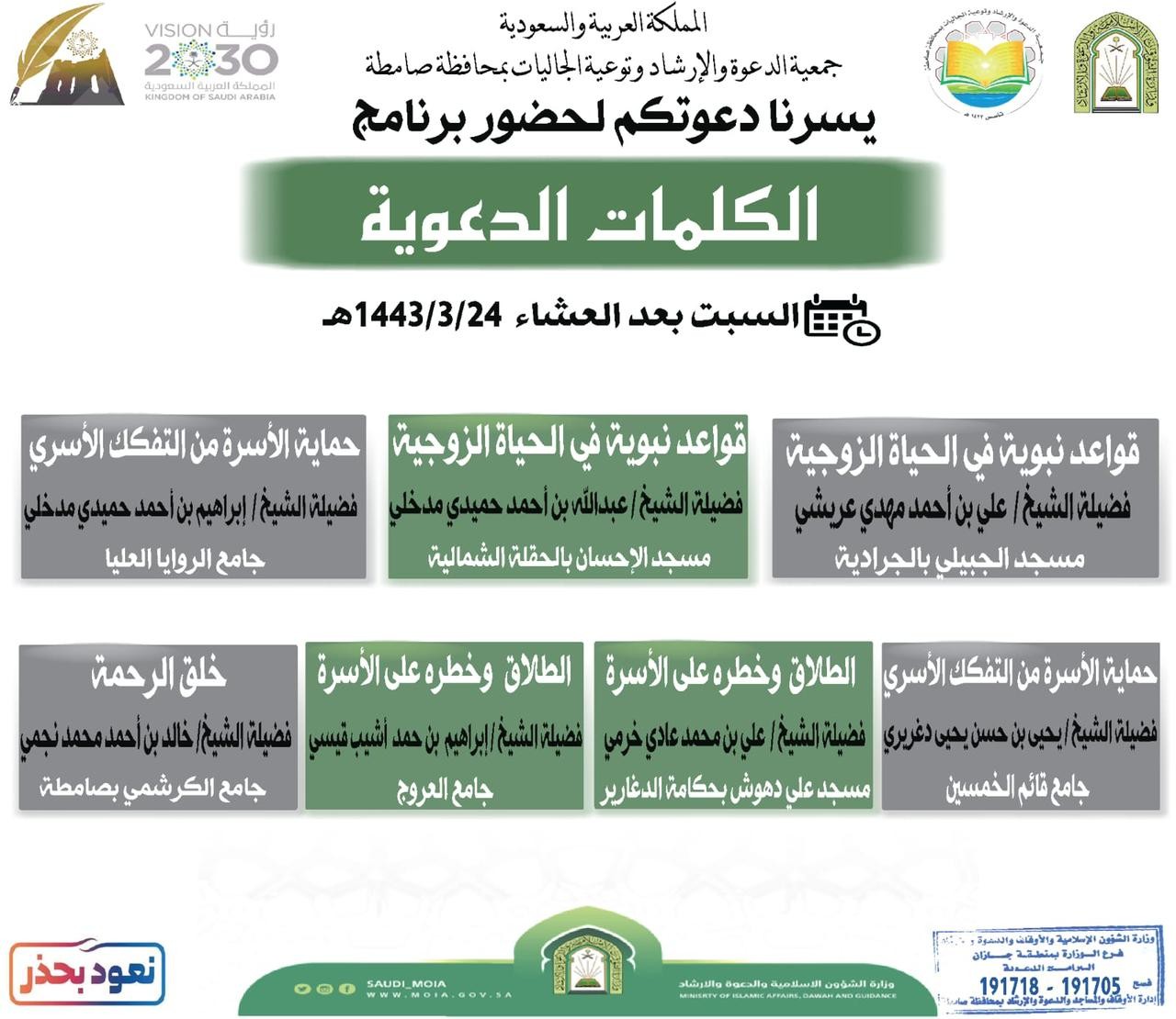 نفّذَ فرع وزارة الشؤون الإسلامية والدعوة والإرشاد في منطقة جازان بالتعاون مع جمعية الدعوة والإرشاد وتوعية الجاليات بمحافظة صامطة عدة كلمات دعوية مساء السبت الموافق 24 / 3 / 1443 هـ , هذا وتحدث أصحاب الفضيلة المشايخ علي بن أحمد عريشي بمسجد الجبيلي في الجرادية , والشيخ عبدالله بن أحمد مدخلي بمسجد الإحسان بالحقلة الشمالية عن " القواعد النبوية في الحياة الزوجية " , وتحدث أيضاً الشيخ إبراهيم بن أحمد مدخلي و الشيخ يحيى بن حسن دغريري عن " حماية الأسرة من التفكك الأسري " وذلك بِجَامِعَيْ الروايا العليا وقائم الخمسين , ونفّذا أيضاً الشيخ علي بن محمد خرمي و الشيخ إبراهيم بن حمد قيسي كلمة " الطلاق وخطره على الأسرة " وذلك بمسجد علي دهوش بحاكمة الدغارير وجامع العروج .