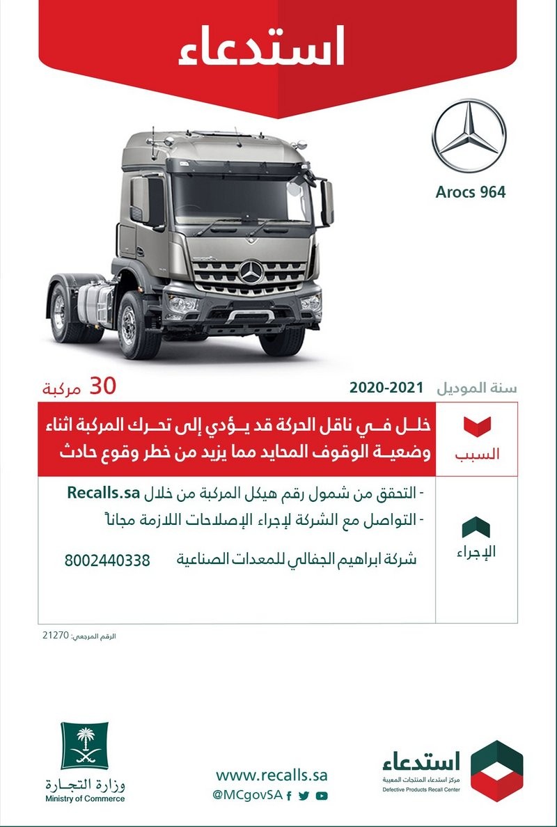 استدعت وزارة التجارة 30 شاحنة مرسيدس "Arocs 964" سنة الصنع 2020 - 2021 م، لخلل في ناقل الحركة؛ قد يؤدي إلى تحرُّك المركبة أثناء وضعية الوقوف المحايد؛ ما يزيد من خطر وقوع حادث.