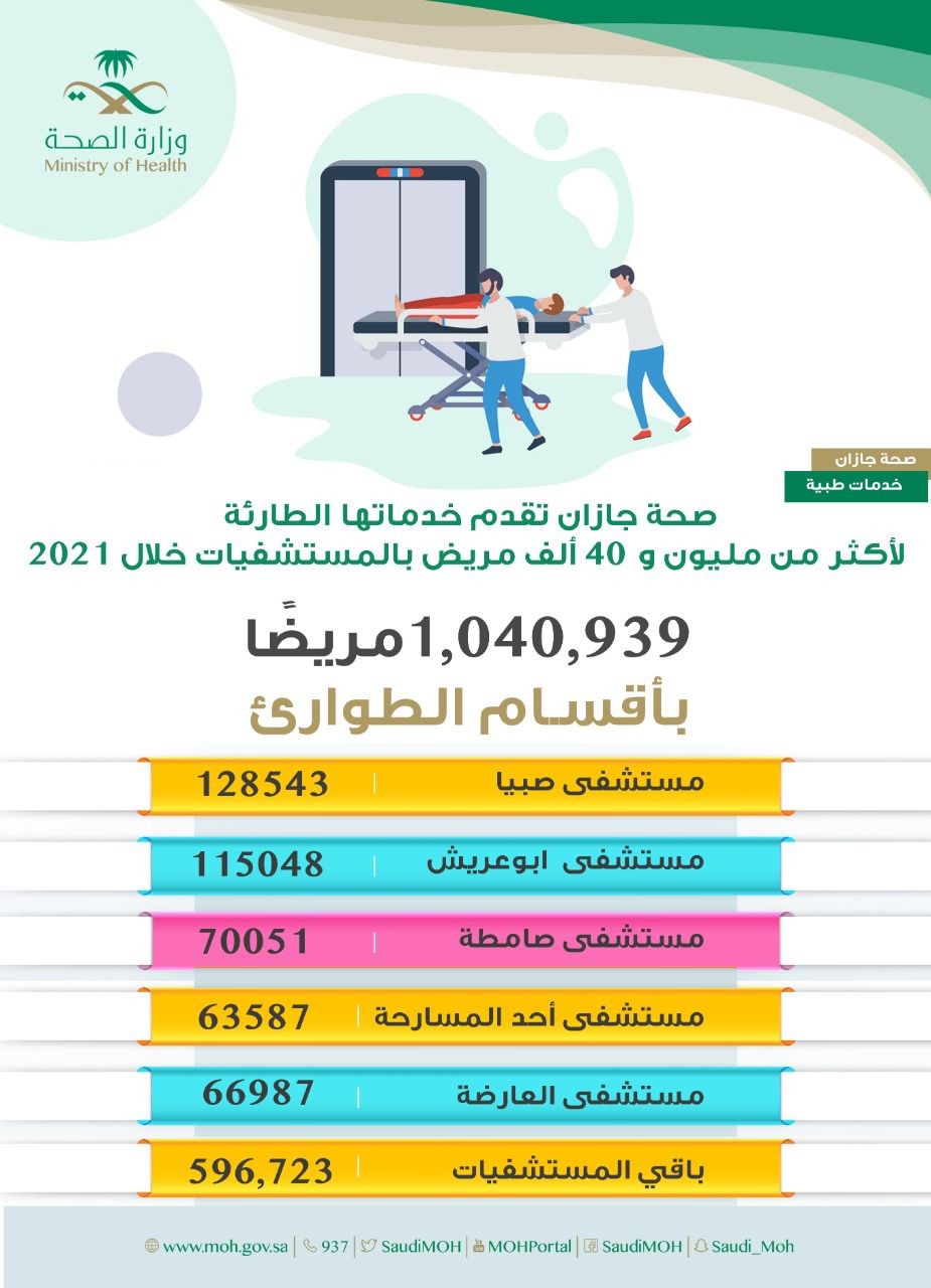 بلغت إحصائية المرضى المستفيدين من أقسام الطوارئ بمستشفيات صحة جازان 1,040,939 مريض تلقى الرعاية الصحية الطارئة خلال هذا العام 2021 م .