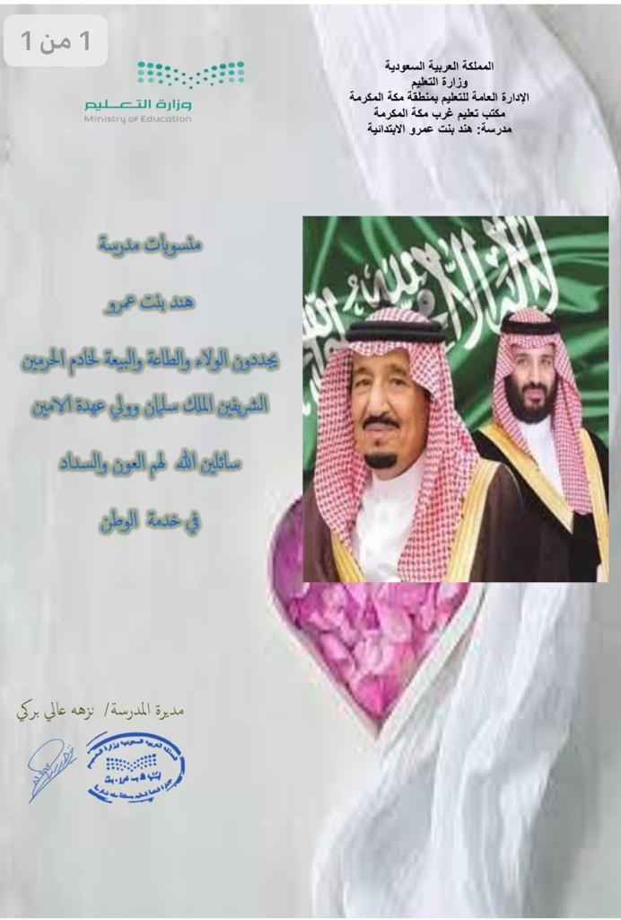 و جاءت مشاركة متوسطة وثانوية العلم النافع بتقديم مجموعة من المشاركات الطلابية والأقوال الوطنية عبر وسائل التواصل، و-,مشاركة الطالبات ومنسوبات المدرسة في التعبير عن مشاعر الولاء والانتماء لقائد مسيرتنا في الحائط الإلكتروني.
