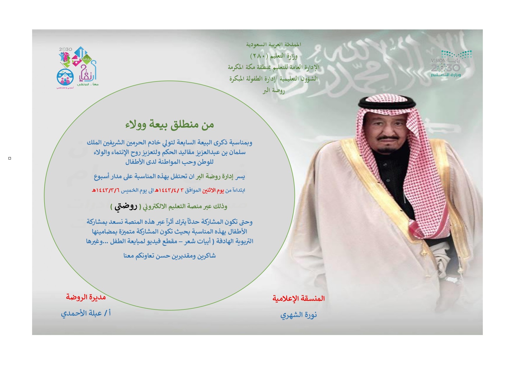أقامت الإدارة العامة للتعليم بمنطقة مكة المكرمة ممثلةً بإدارة الطفولة المبكرة ولمدة يومين إبتداءً من يوم الأحد الموافق 2 / 4 / 1443هـ، احتفالاً بذكرى البيعة السابعة لتولي الملك سلمان بن عبد العزيز مقاليد الحكم عبر المنصات المعتمدة تحت إشراف مديرة الإدارة زكية الصبحي.