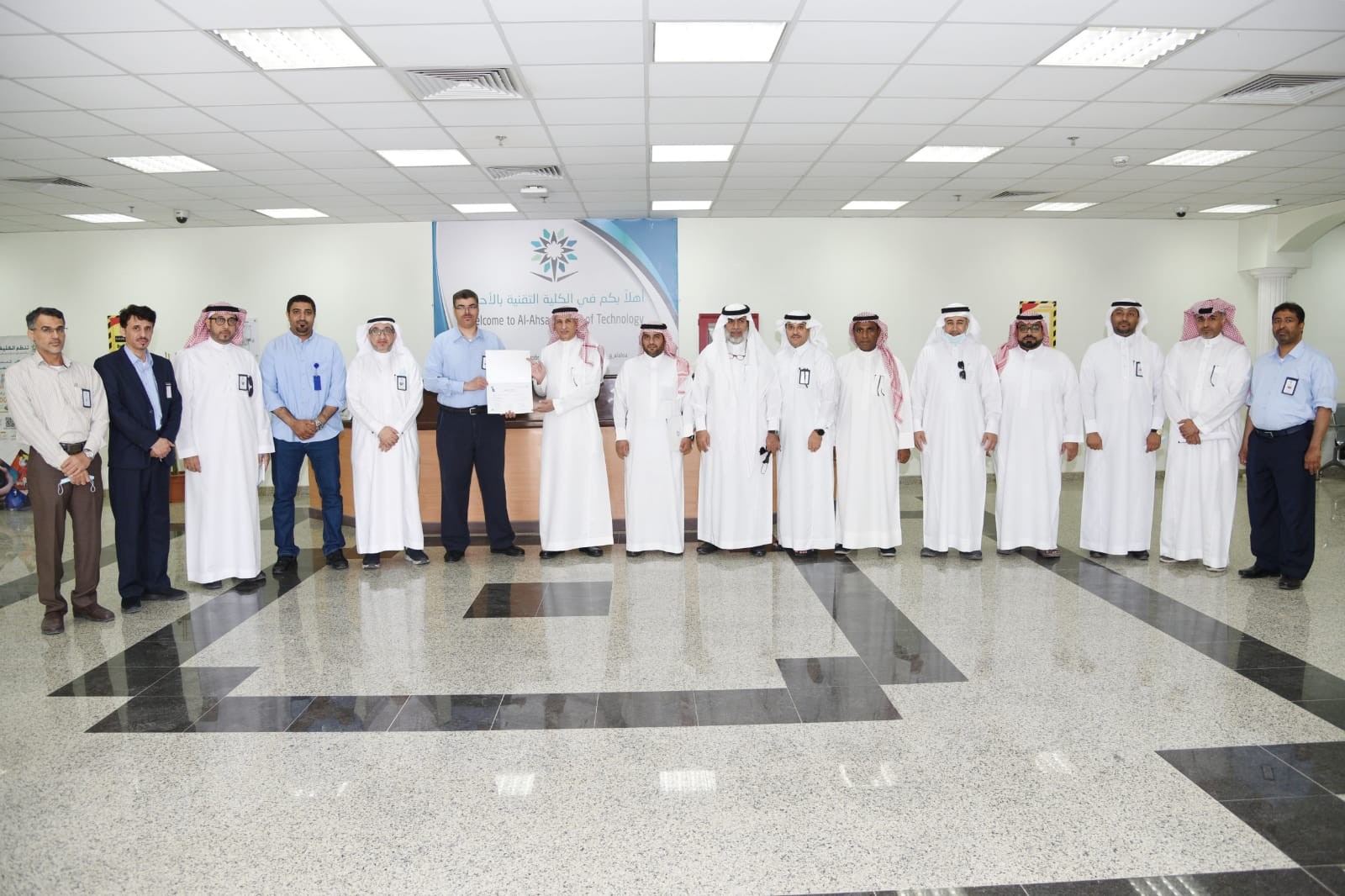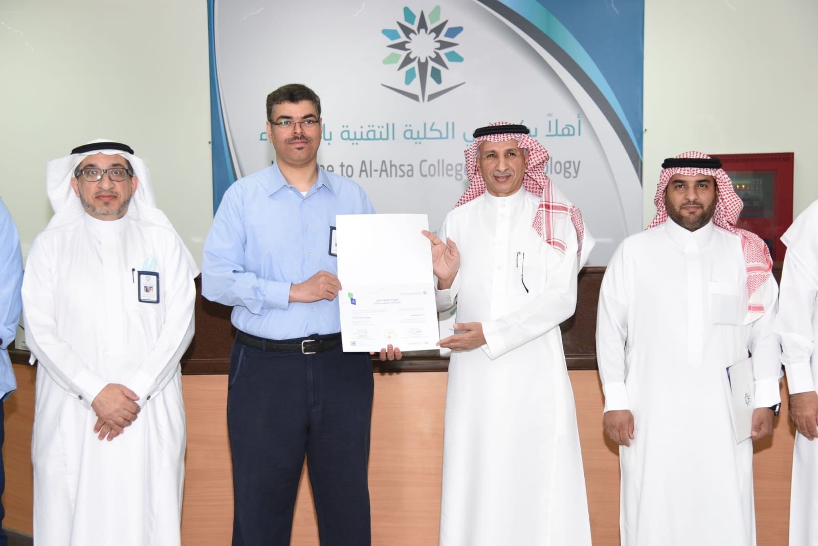 وسلم نائب محافظ المؤسسة العامة للتدريب التقني والمهني لسياسات التدريب و الجودة الدكتور عبدالله بن مستور آل مرزوق شهادة الاعتماد لعميد الكلية التقنية بالأحساء صالح بن ناصر الرزيحان بحضور مدير عام التدريب التقني والمهني بالمنطقة الشرقية المهندس بدر بن إبراهيم العبدالواحد في حفل أقيم بهذه المناسبة في القاعة المتعددة الأغراض بمشاركة وكلاء الكلية ورؤساء الأقسام ومدراء الإدارات ، حيث قدم المرزوق تهنئته لكلية الأحساء لتحقيق هذا الانجاز الغير مستغرب في ظل وجود إدارة متمكنة تعمل بخطط واستراتيجيات وسياسات وأهداف تسعى لتحقيقها، وأضاف آل مرزوق بأن الاعتماد سيكون داعم لمواصلة تطوير عمليات الكلية من خلال تطبيق معاييــر الاعتماد بمـا يعـزز كفـاءة التدريـب والارتقاء بنواتــجه للمنافســة فــي سوق العمل وفق رؤيـة المملكـة 2030 من خلال التحفيز الكلي و بمشــاركة أصحــاب المصلحــة نحـو تبنّي سياسـات ونظـم تعـزز كفـاءة رأس المـال البشـري لتحقيـق القـدرة التنافسـية والجـودة والمرونـة والشفافية