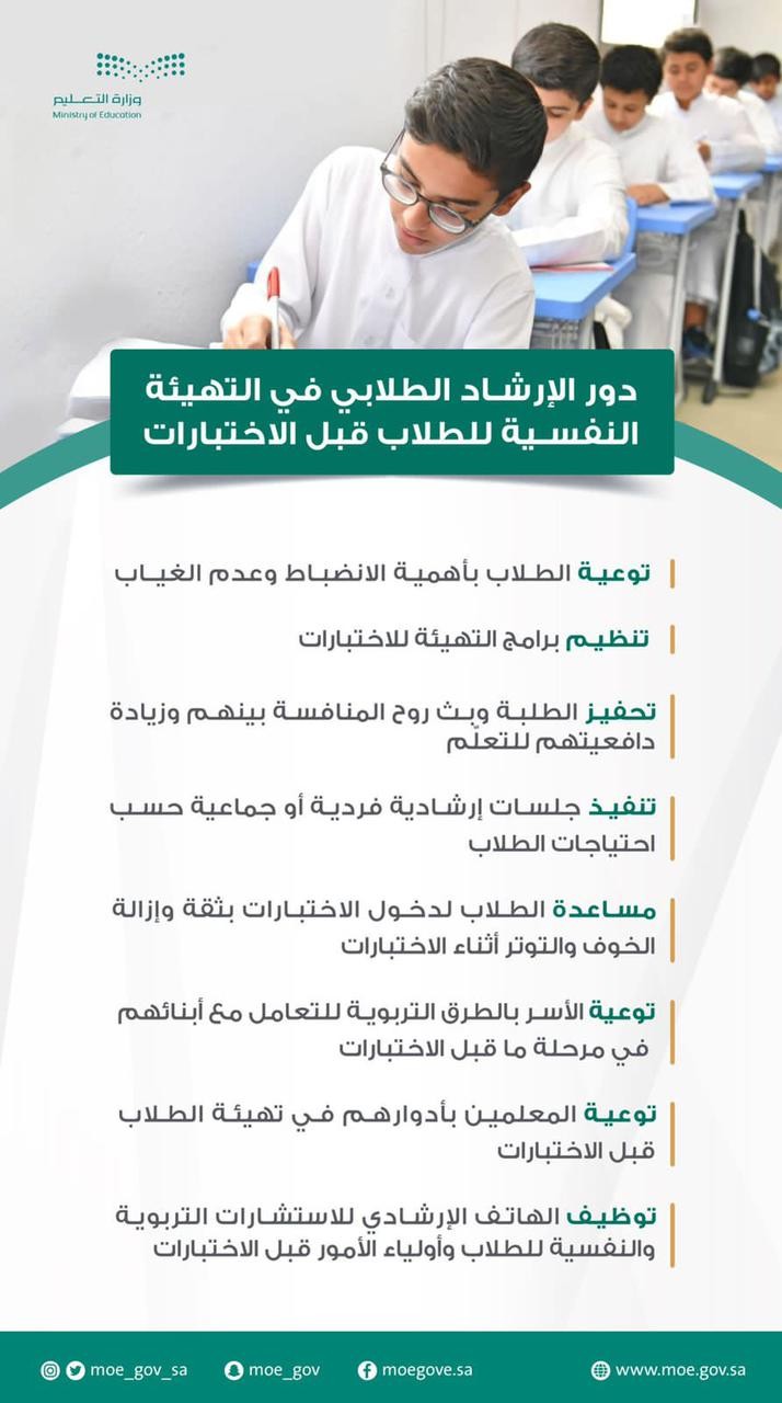 وأعلنت إدارات التعليم عن حزمة من التوجيهات التي تعزز استعداد الطلبة لأداء الاختبارات الحضورية، مشتملةً على أهمية تنظيم الوقت، وتوفير بيئة مناسبة للاستذكار، والتدريب على الاختبارات المشابهة، إضافة إلى تعزيز الشراكة مع الأسرة وأولياء الأمور في تهيئة الطلبة نفسياً لأداء الاختبارات التحريرية حضورياً.