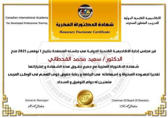 منحت الأكاديمية الكندية الدولية للتدريب المتطور المحترف رئيس الإتحاد السعودي لرياضة الصم الأستاذ/سعيد محمد القحطاني، شهادة الدكتوراة الفخرية تقديراً لجهوده المبذولة و إسهاماته فى الرياضة و رعاية حقوق ذوي الهمم في الوطن العربى.