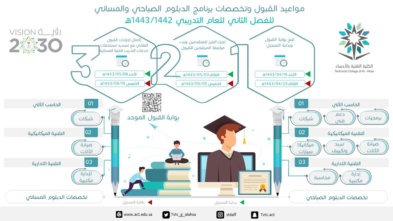 تقنية الأحساء تفتح التسجيل للفصل الثاني للدبلوم الصباحي والمسائي لخريجي الثانوية