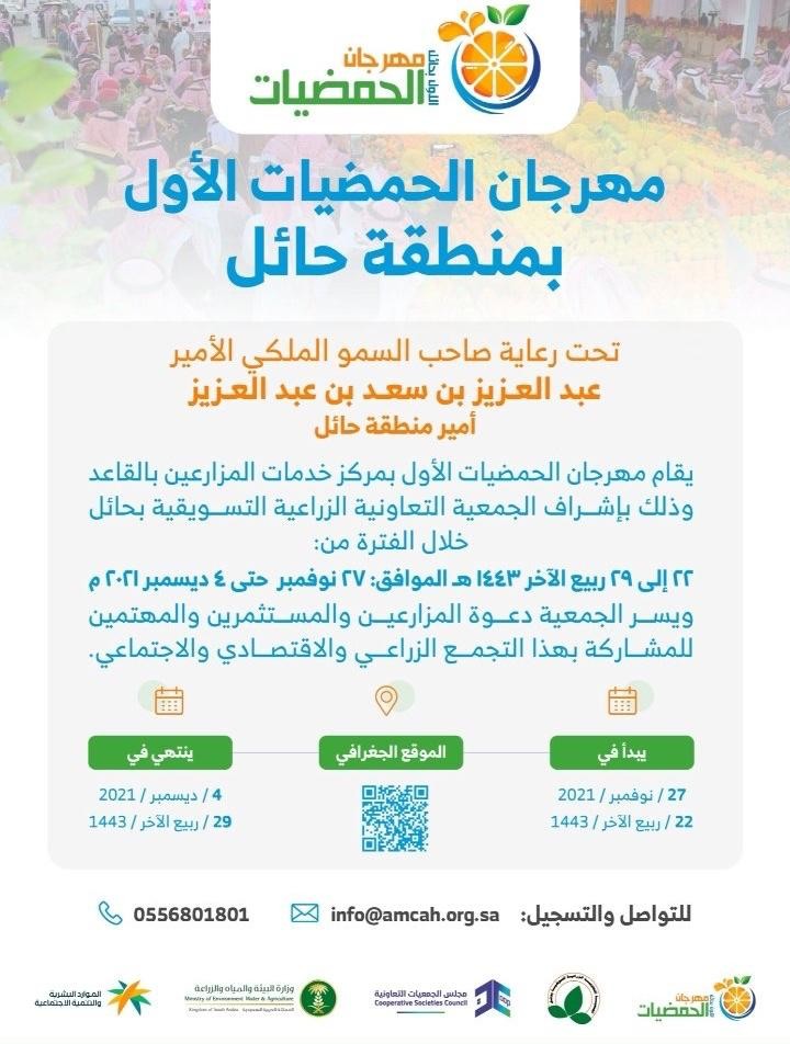 أنهت اللجان العاملة في مهرجان الحمضيات الأول بمنطقة حائل ‏استعداداتها لأطلاق النسخة الأولى من المهرجان الذي تنطلق ‏فعالياته في 22 حتى 29 4 1443هـ بمشاركة وزارة البيئة والمياه ‏والزراعة ‏ووزارة الموارد البشرية والتنمية الاجتماعية ومجلس الجمعيات ‏التعاونية ‏تحت إشراف الجمعية التعاونية الزراعية التسويقية بالمنطقة، ‏وذلك ‏بمركز القاعد بالمنطقة.‏