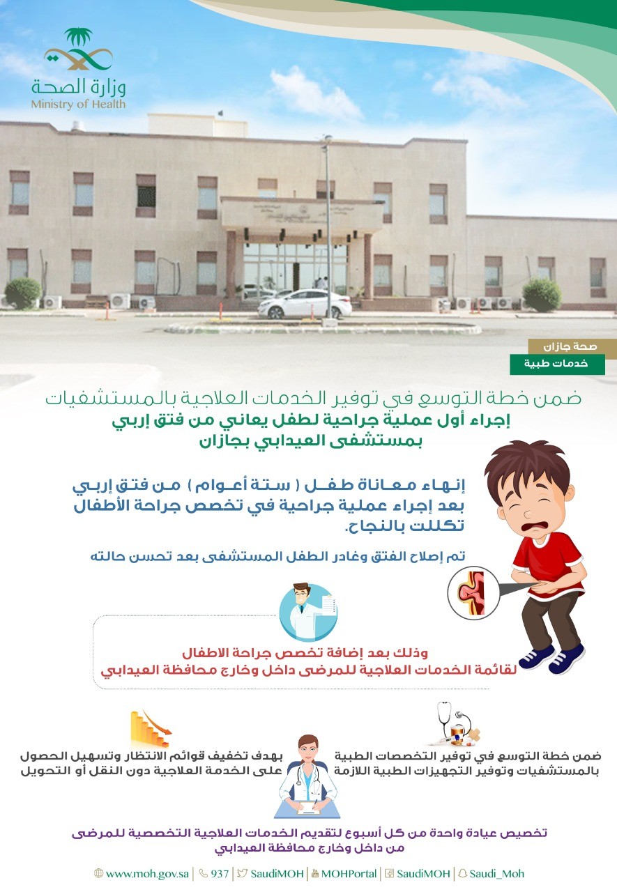 تمكن فريق طبي بمستشفى العيدابي بجازان من إنهاء معاناة طفل من فتق إربي بعد إجراء أول عملية جراحية في تخصص جراحة الأطفال تكللت بالنجاح ولله الحمد ، وذلك بعد إضافة تخصص جراحة الاطفال لقائمة الخدمات العلاجية للمرضى داخل وخارج محافظة العيدابي