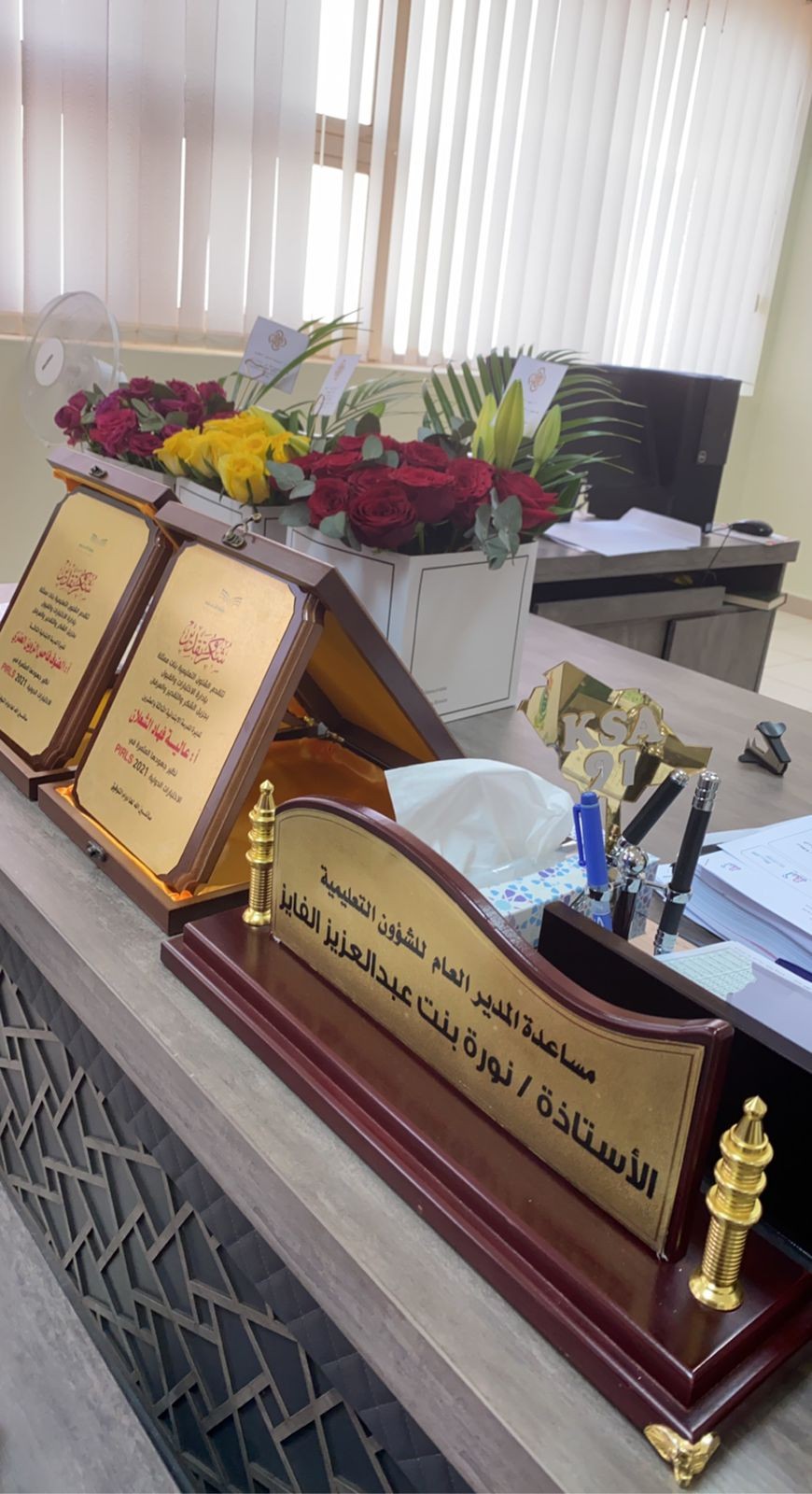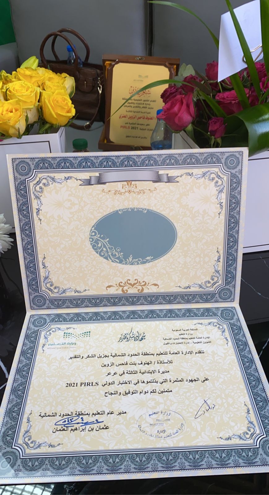 كرمت اليوم الإدارة العامة للتعليم بمنطقة الحدود الشمالية المساعد للشؤون التعليمية بنات الاستاذة نورة بنت عبدالعزيز الفايز مديرات المدارس العينة المشاركة في الاختبارات الدولية بيرلز ٢٠٢١ مديرة الابتدائية الثالثة الأستاذة الهنوف الزوين ومديرة الابتدائية الثالثة والعشرون الأستاذة عالية فهاد الشعلان بحضور مديرة إدارة الاختبارات والقبول الاستاذة نوال المجلاد ومديرة إدارة الإشراف التربوي الأستاذة هدى الخضر