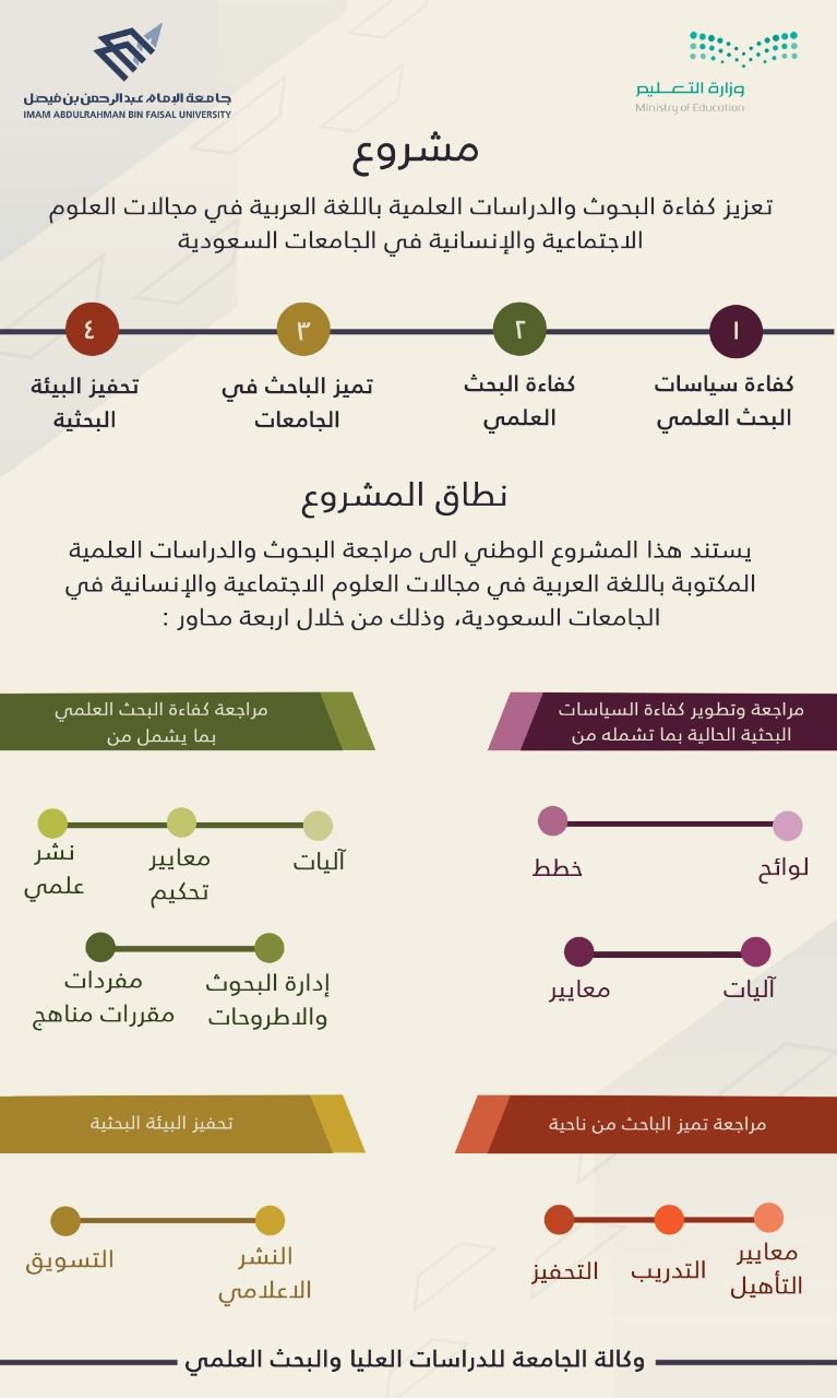 قامت جامعة الامام عبد الرحمن بن فيصل ممثلة بوكالة الدراسات العليا والبحث العلمي بتدشين مشروع "تعزيز كفاءة البحوث والدراسات العلمية باللغة العربية في الجامعات السعودية" الذي يأتي ضمن مشاريع وزارة التعليم الوطنية .