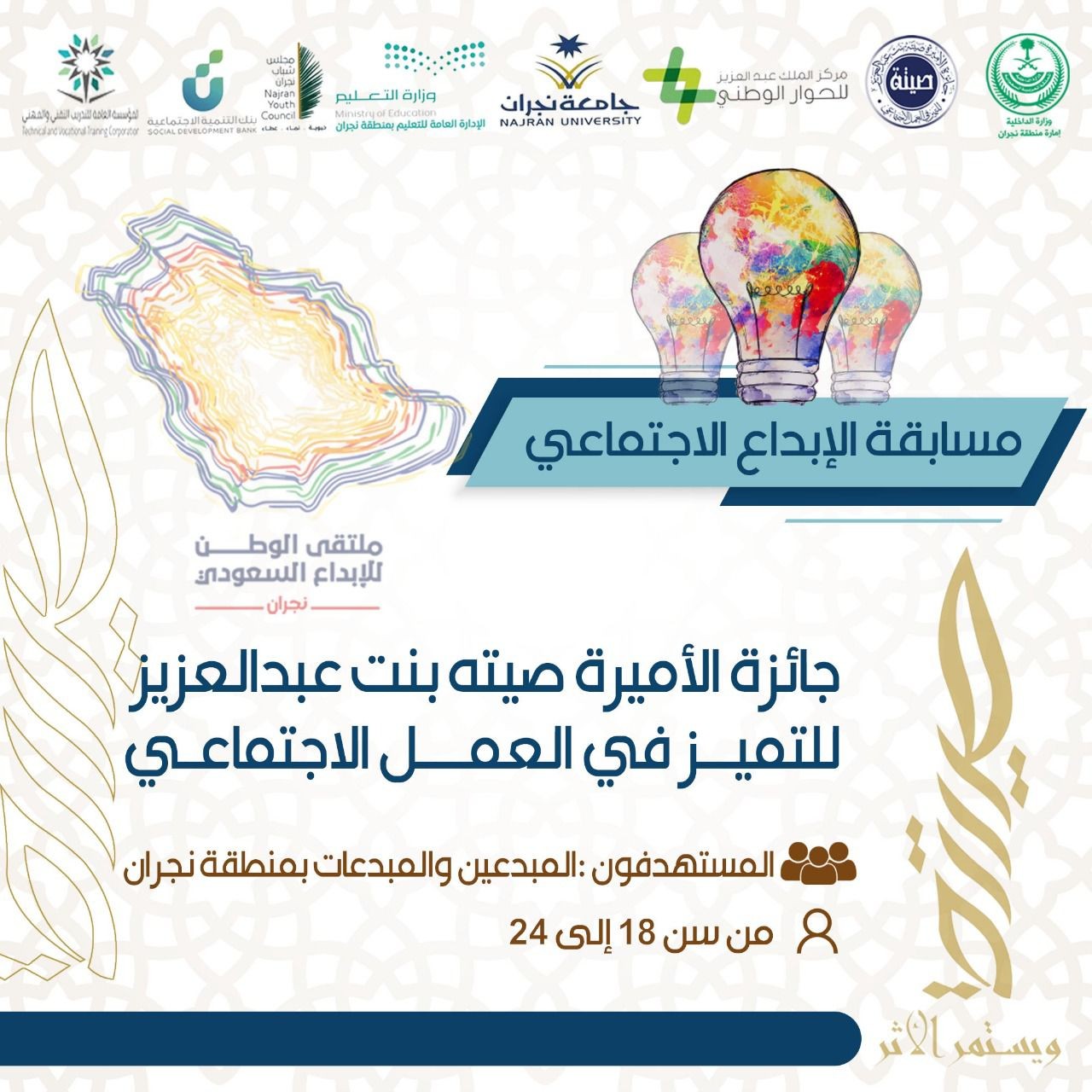 برعاية كريمة من سمو أمير منطقة نجران أعلن ملتقى الوطن للإبداع السعودي والمقرر تدشينه في 20 ديسمبر القادم، مسابقة جائزة الأميرة صيته للتميز في العمل المجتمعي "الإبداع الاجتماعي" والتي تستهدف الشباب والشابات بمنطقة نجران، للفئات العمرية من 18 الى 24 عام وذلك في إطار الأتفاقية المشتركة مع مجلس شباب المنطقة.