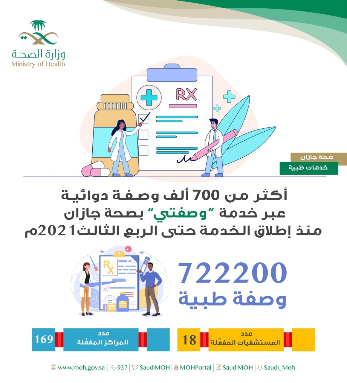 أوضحت صحة جازان بأنه تم صرف 722200 وصفة طيبة منذ إطلاق الخدمة حتى الربع الثالث من العام 2021م عن طريق خدمة وصفتي لعدد من المستشفيات والمراكز الصحية البالغ عددها 187 مركزا مفعلا لخدمة وصفتي.